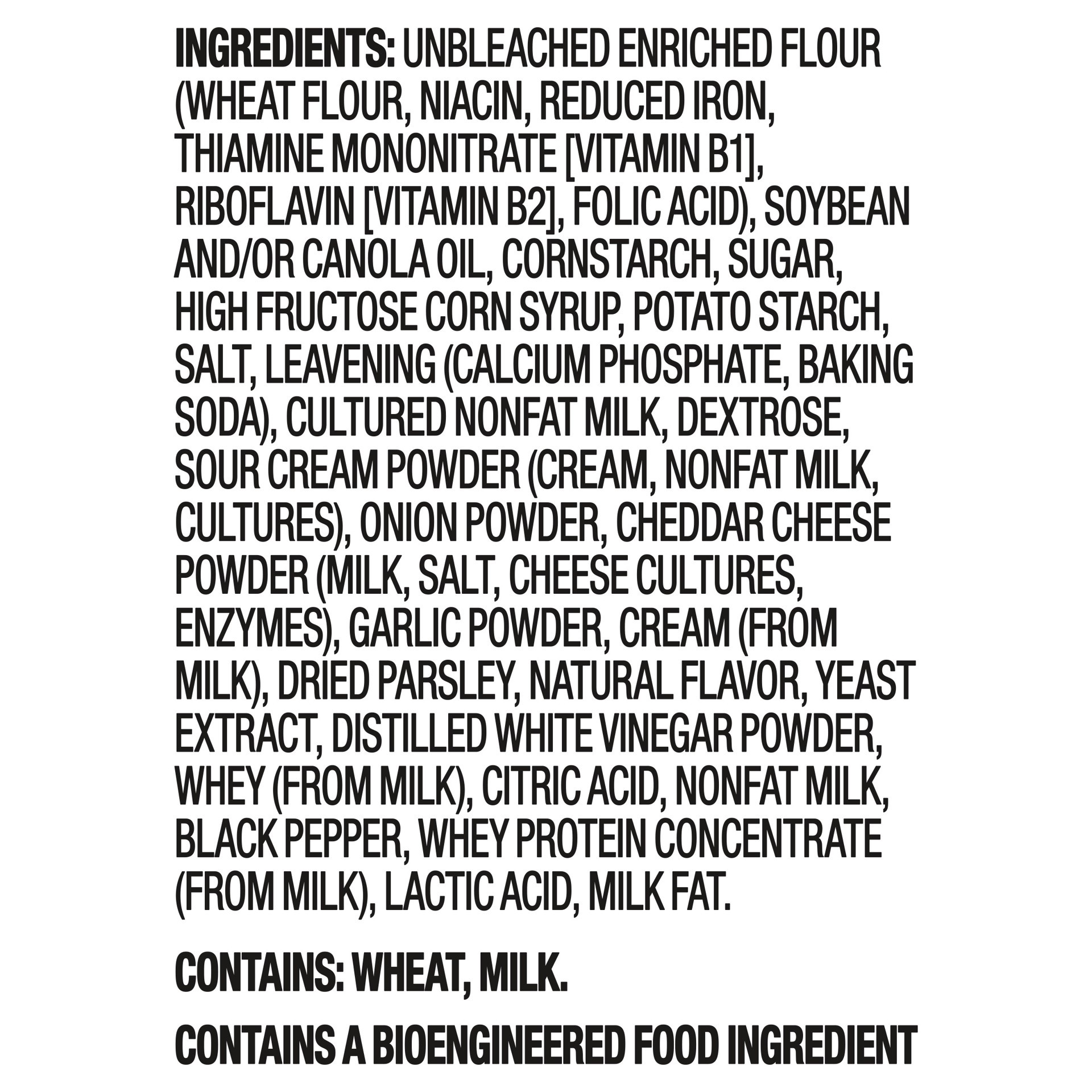INGREDIENTS: UNBLEACHED ENRICHED FLOUR (WHEAT FLOUR, NIACIN, REDUCED IRON, THIAMINE MONONITRATE [VITAMIN B1], RIBOFLAVIN [VITAMIN B2], FOLIC ACID), SOYBEAN AND/OR CANOLA OIL, CORNSTARCH, SUGAR, HIGH F…