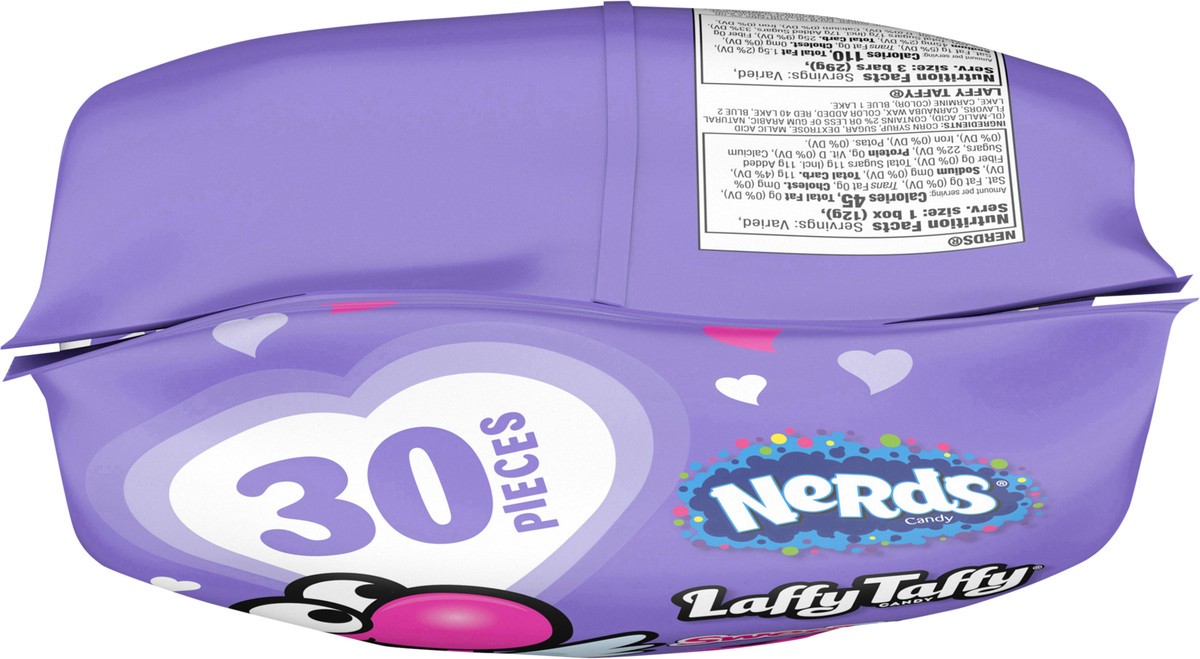 Nerds: Corn Syrup, Sugar, Dextrose, Malic Acid (DL-Malic Acid), Contains 2% or Less of Gum Arabic, Natural Flavors, Carnauba Wax, Color Added, Red 40 Lake, Blue 2 Lake, Carmine (Color), Blue 1 Lake. L…