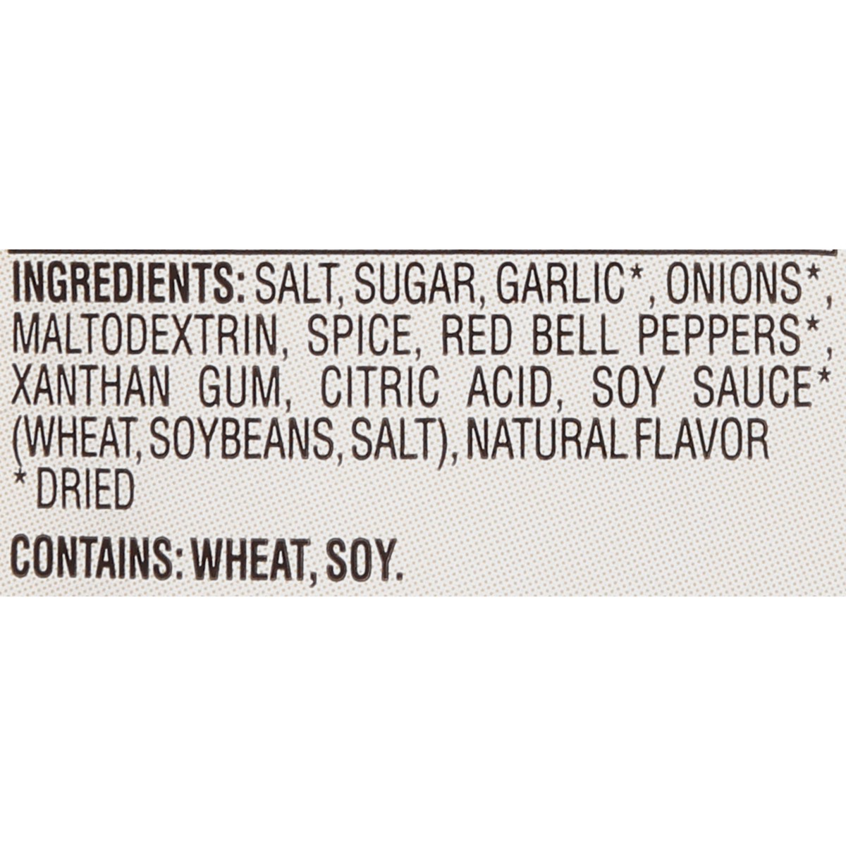 Salt, Sugar, Garlic (Dried), Onions (Dried), Maltodextrin, Spice, Red Bell Peppers (Dried), Xanthan Gum, Citric Acid, Soy Sauce (Dried) (Wheat, Soybeans, Salt), Natural Flavor.