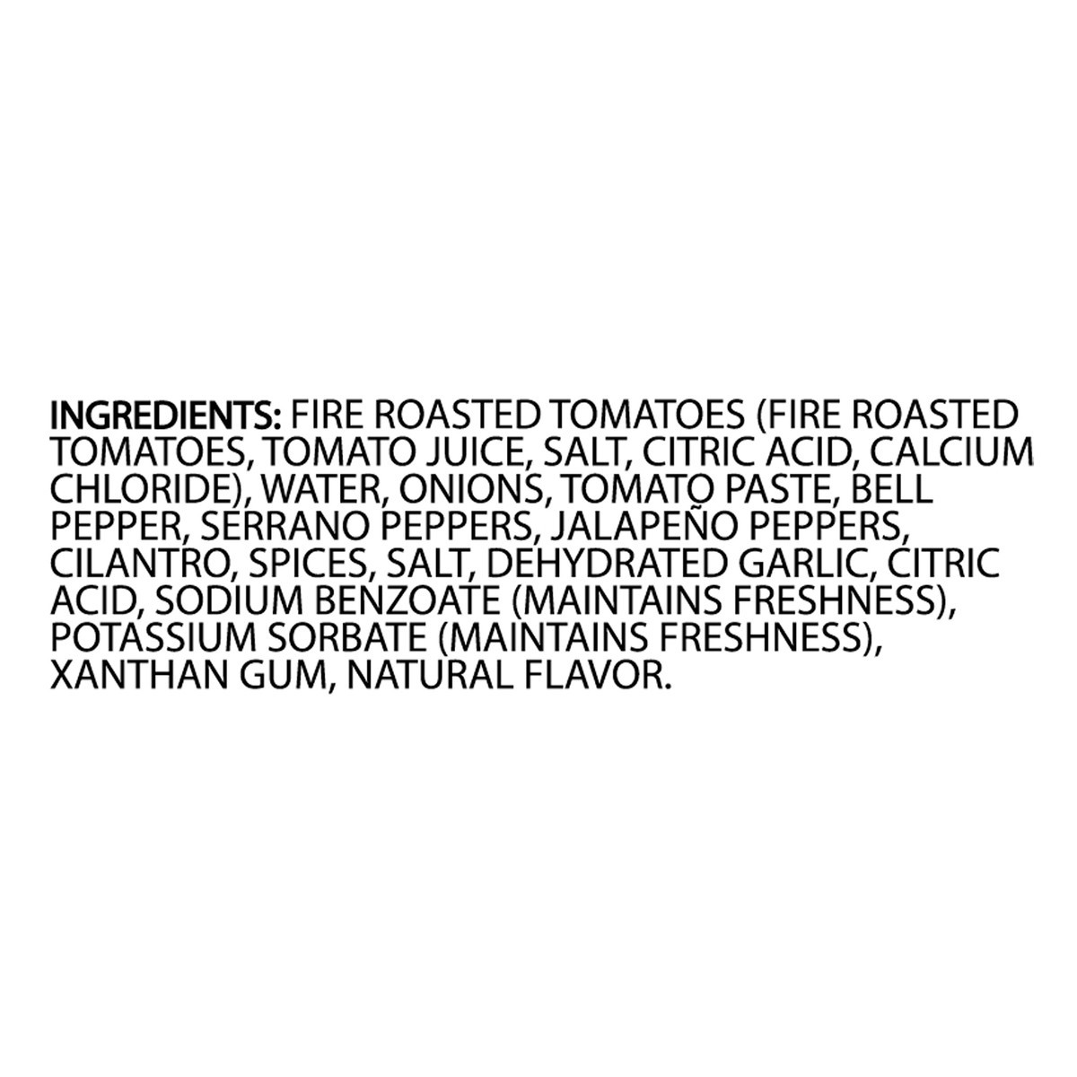 Fire Roasted Tomatoes (Fire Roasted Tomatoes, Tomato Juice, Salt, Citric Acid, Calcium Chloride), Water, Onions, Tomato Paste, Bell Pepper, Serrano Peppers, Jalapeno Peppers, Cilantro, Spices, Salt, D…