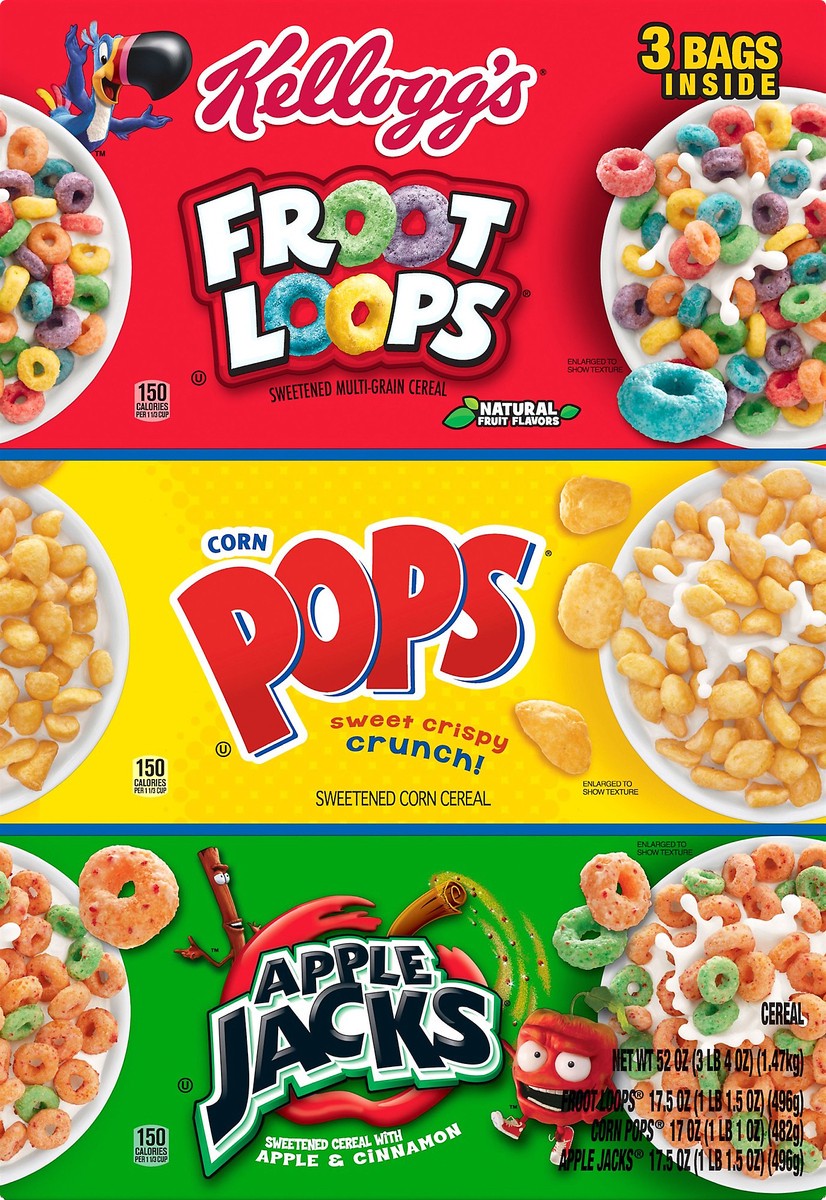 Sweetened multi-grain cereal. Sweetened corn cereal. Sweetened cereal with apple & cinnamon. Froot Loops: Natural fruit flavors. Froot Loops: 150 calories per 1-1/3 cup. Corn Pops: 50 calories per 1-1…