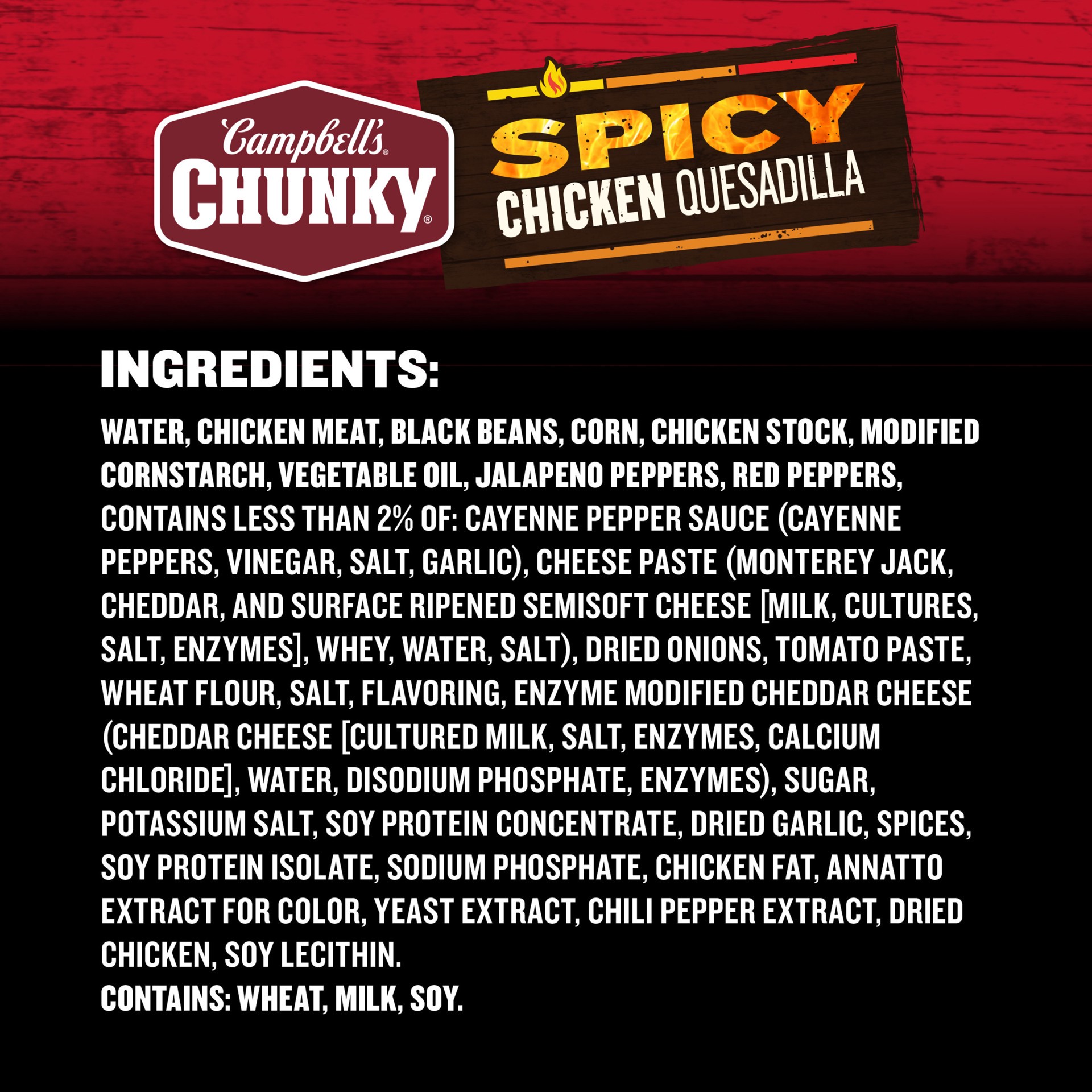 Campbell''s Chunky Spicy Chicken Quesadilla Soup brings the zesty taste of the Southwest to a fill-you-up, ready-to-eat soup. With mouth-watering flavors and bold ingredients, this spicy soup is capab…