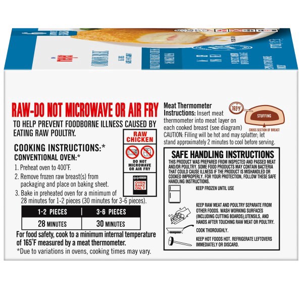 Raw chicken breast, stuffed with a delicious blend of Swiss and American cheeses and a tender slice of cooked ham. Coated with a lightly seasoned, crispy multi-grain breading.