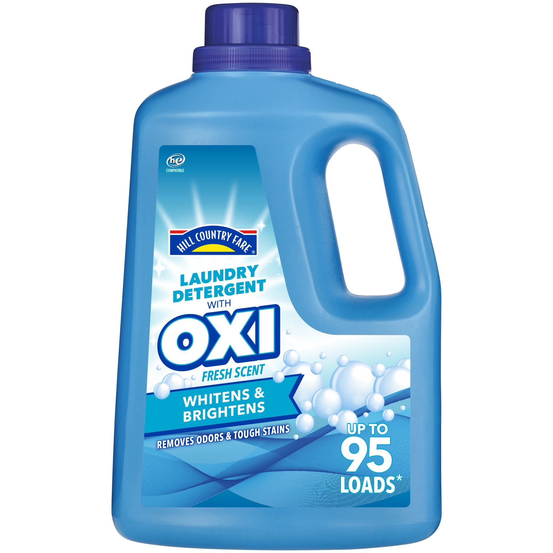 For an extra stain-fighting boost, count on Hill Country Fare laundry detergent with OXI. Offering 95 loads* worth of odor-removing cleaning power, it's HE-compatible for all washing machines, all fab…