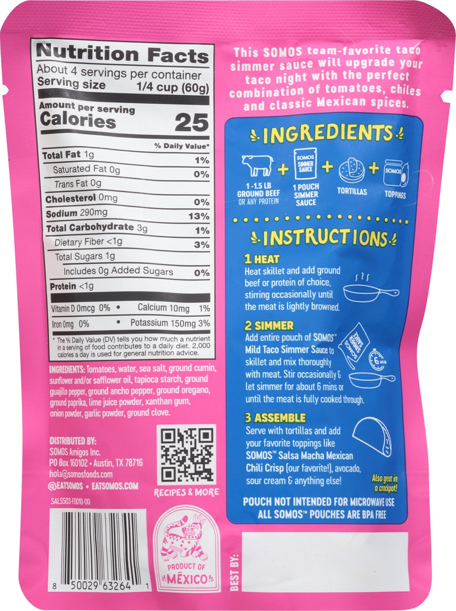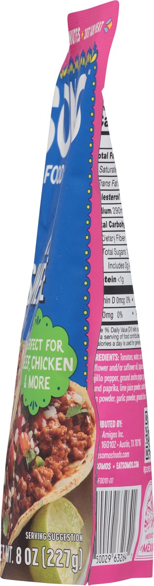 Tomatoes, Water, Sea Salt, Ground Cumin, Sunflower and/or Safflower Oil, Tapioca Starch, Ground Guajillo Pepper, Ground Ancho Pepper, Ground Oregano, Ground Paprika, Lime Juice Powder, Xanthan Gum, On…