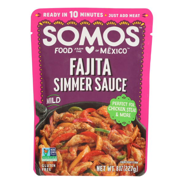 Gluten free. Non-GMO Project verified. nongmoproject.org. Ready in 10 minutes. Just add meat. This savory fajita simmer sauce, made with mild chiles, a blend of spices and tomatoes, is an old family r…