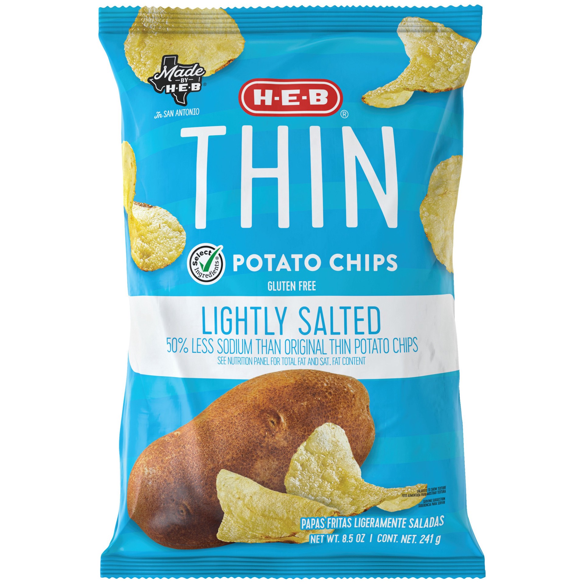 Boasting 50% less sodium* than our regular version, H-E-B lightly salted thin potato chips are deliciously crunchy and best enjoyed by the handful. And with no artificial flavors or certified syntheti…
