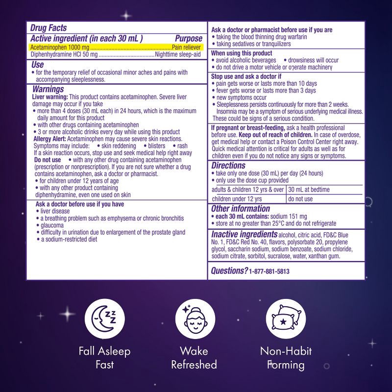 - NO PILLS: ZzzQuil Liquid Sleep Aid Night Pain is a liquid formula with 1000mg acetaminophen and diphenhydramine 50mg HCI to fall asleep fast without the need for sleeping pills.