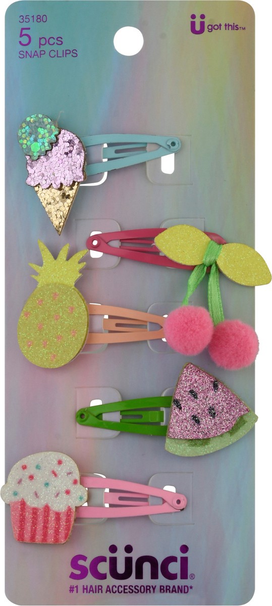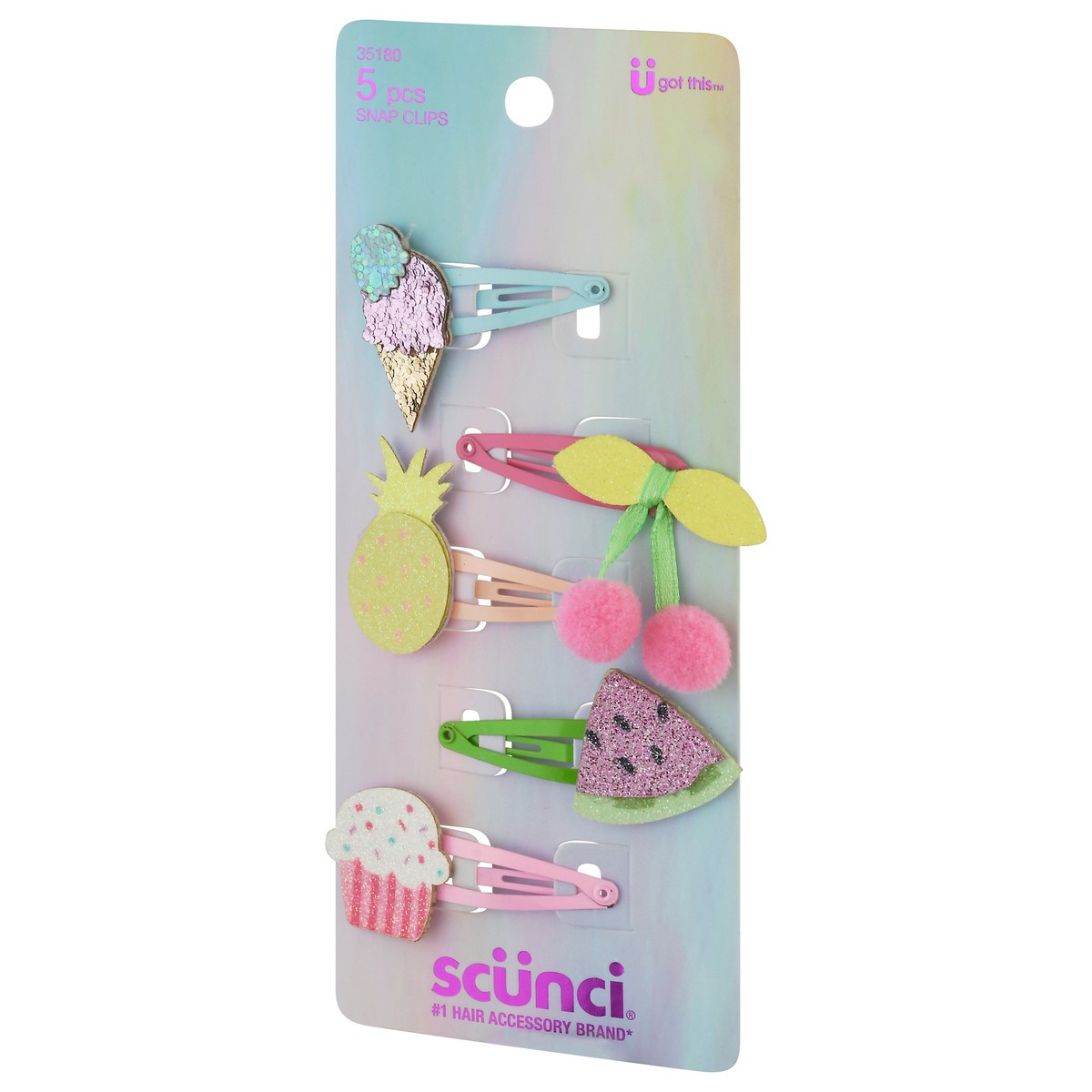 Clip on these fruity-fresh and totally tasty snap clips to add extra sweetness to ponytails, pigtails, bangs, and buns! Glitter coated treats catch the sun's rays and give hair a special sparkle that'…