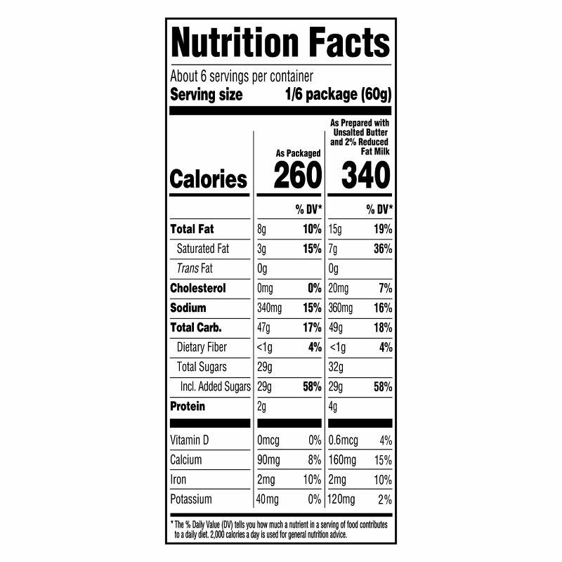 - Contains 340 calories per serving when prepared according to instructions on the box