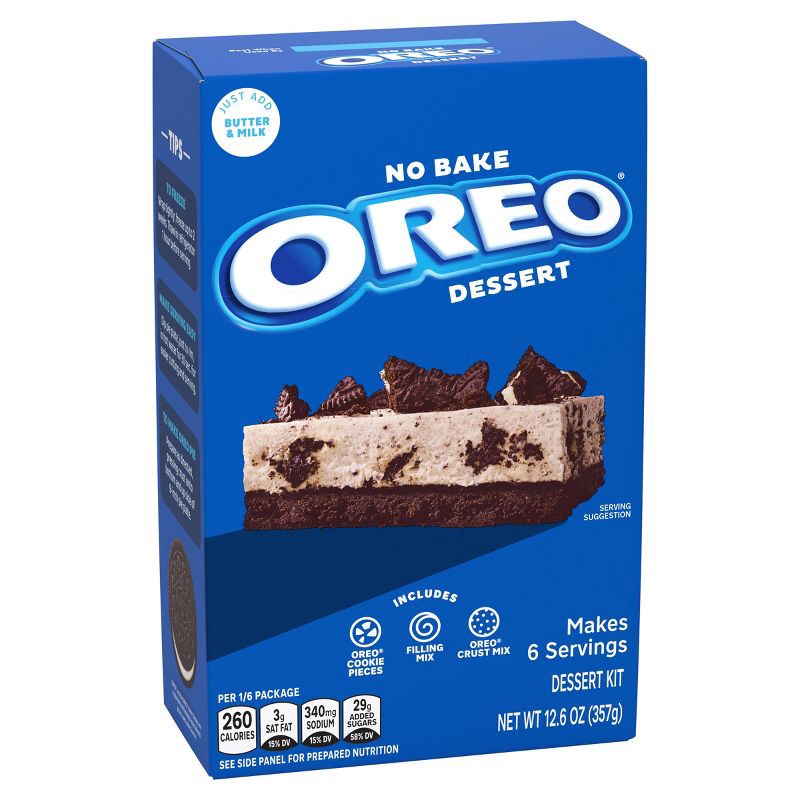 - Jell-O No Bake Oreo Dessert Kit features a chocolate cookie crust, cookies and cream filling, and cookie piece topping
