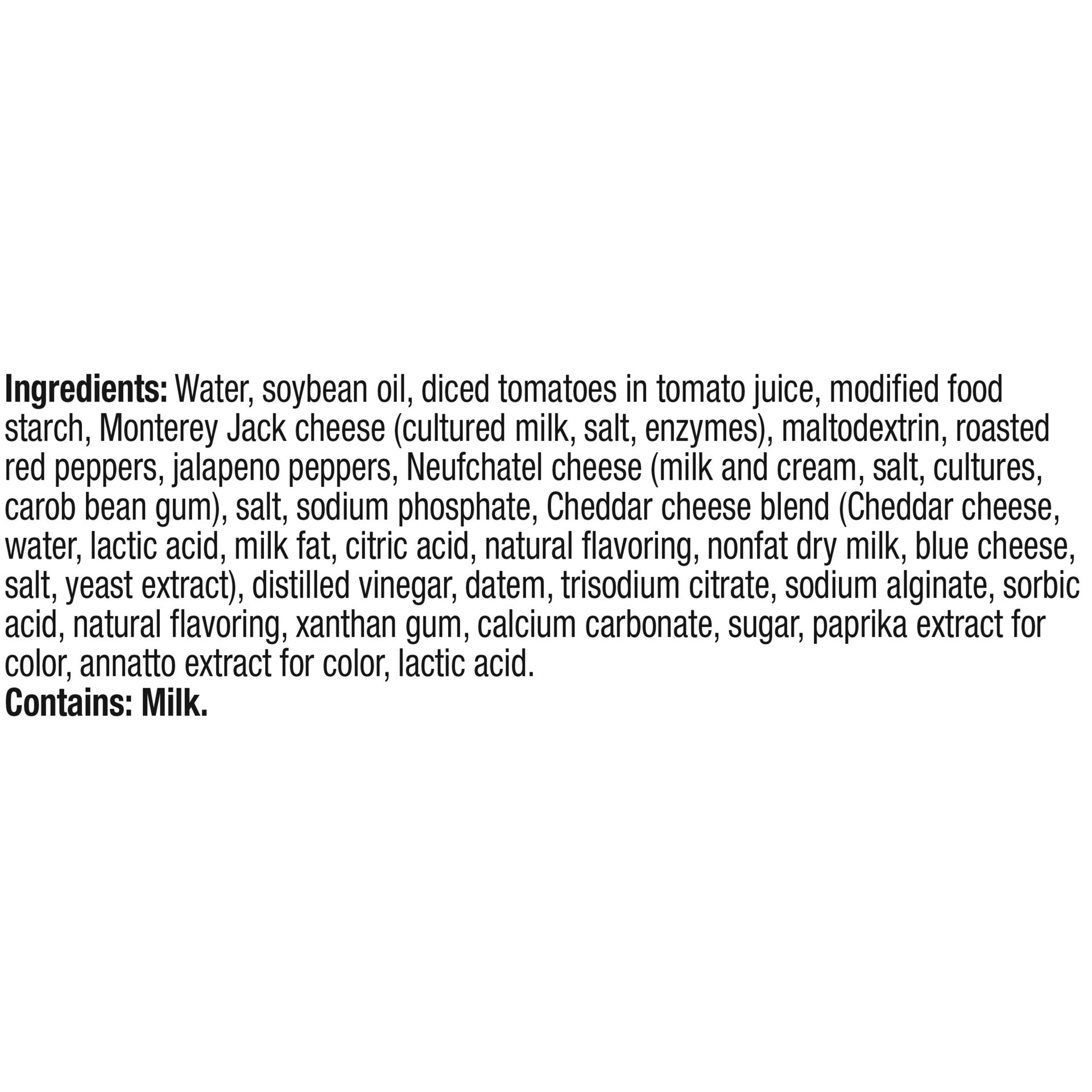 INGREDIENTS: WATER, SOYBEAN OIL, DICED TOMATOES IN TOMATO JUICE, MODIFIED FOOD STARCH, MONTEREY JACK CHEESE (CULTURED MILK, SALT, ENZYMES), MALTODEXTRIN, ROASTED RED PEPPERS, JALAPENO PEPPERS, NEUFCHA…