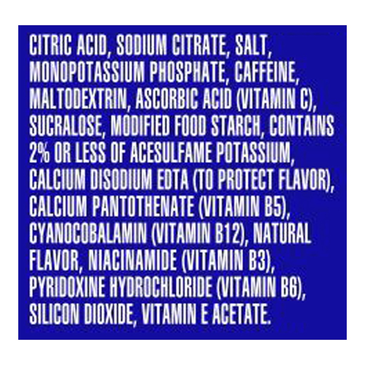 Citric Acid, Sodium Citrate, Salt, Monopotassium Phosphate, Caffeine, Maltodextrin, Ascorbic Acid (Vitamin C), Sucralose, Modified Food Starch, Contains 2% or Less of Acesulfame Potassium, Calcium Dis…