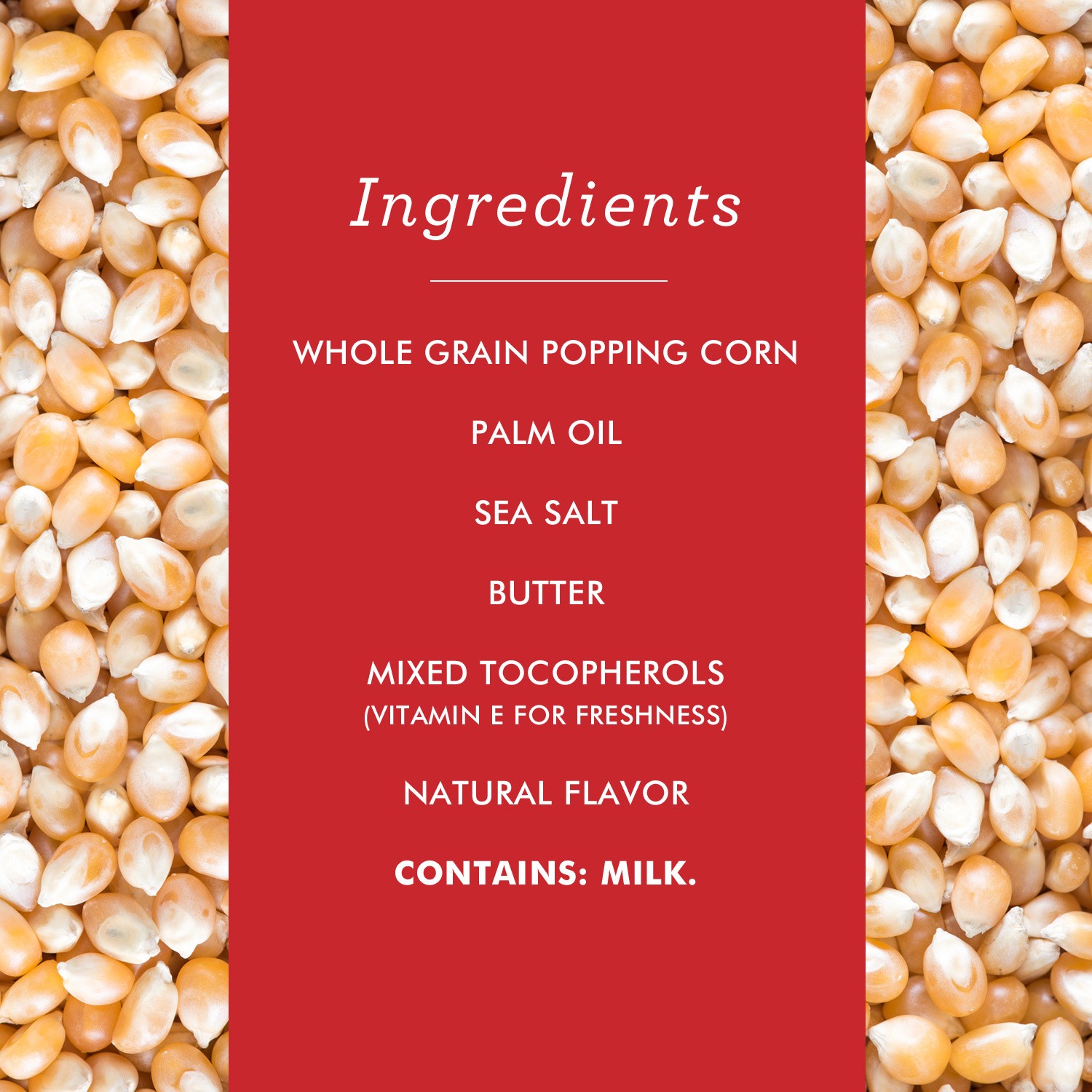 Whole Grain Popping Corn, Palm Oil, Sea Salt, Mixed Tocopherols (Vitamin E for freshness), Natural Flavor (Including Milk).