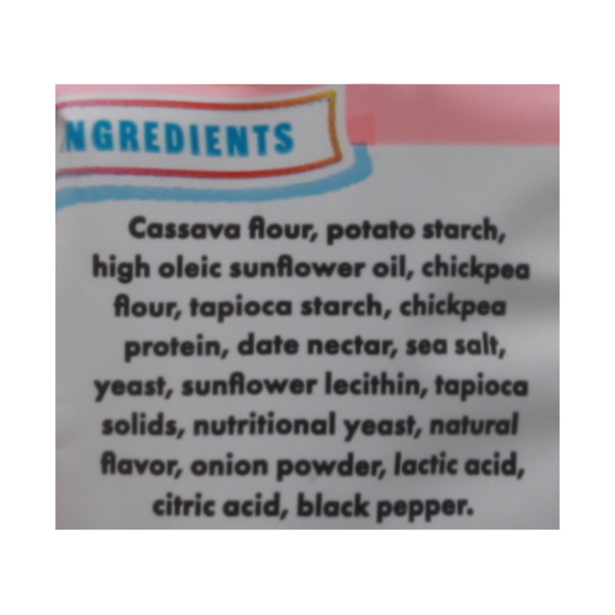 Cassava Flour, Potato Starch, High Oleic Sunflower Oil, Chickpea Flour, Tapioca Starch, Date Nectar, Sea Salt, Yeast, Sunflower Lecithin, Tapioca Solids, Nutritional Yeast, Natural Flavor, Onion Powde…