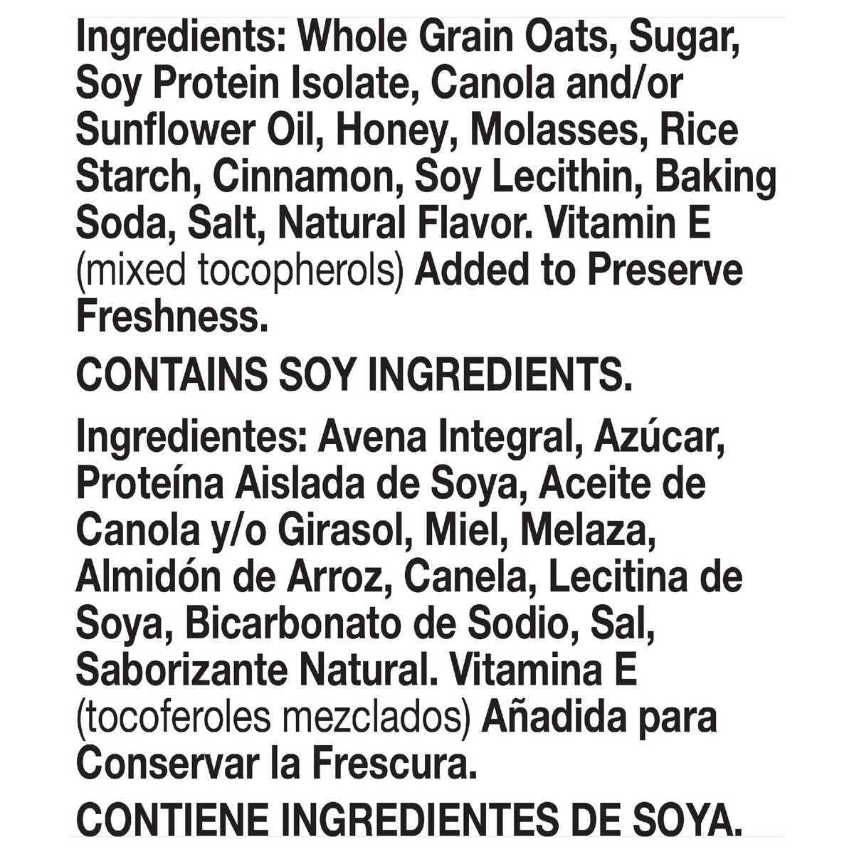 Whole Grain Oats, Sugar, Soy Protein Isolate, Canola and/or Sunflower Oil, Honey, Molasses, Rice Starch, Cinnamon, Soy Lecithin, Baking Soda, Salt, Natural Flavor. Vitamin E (Mixed Tocopherols) Added …