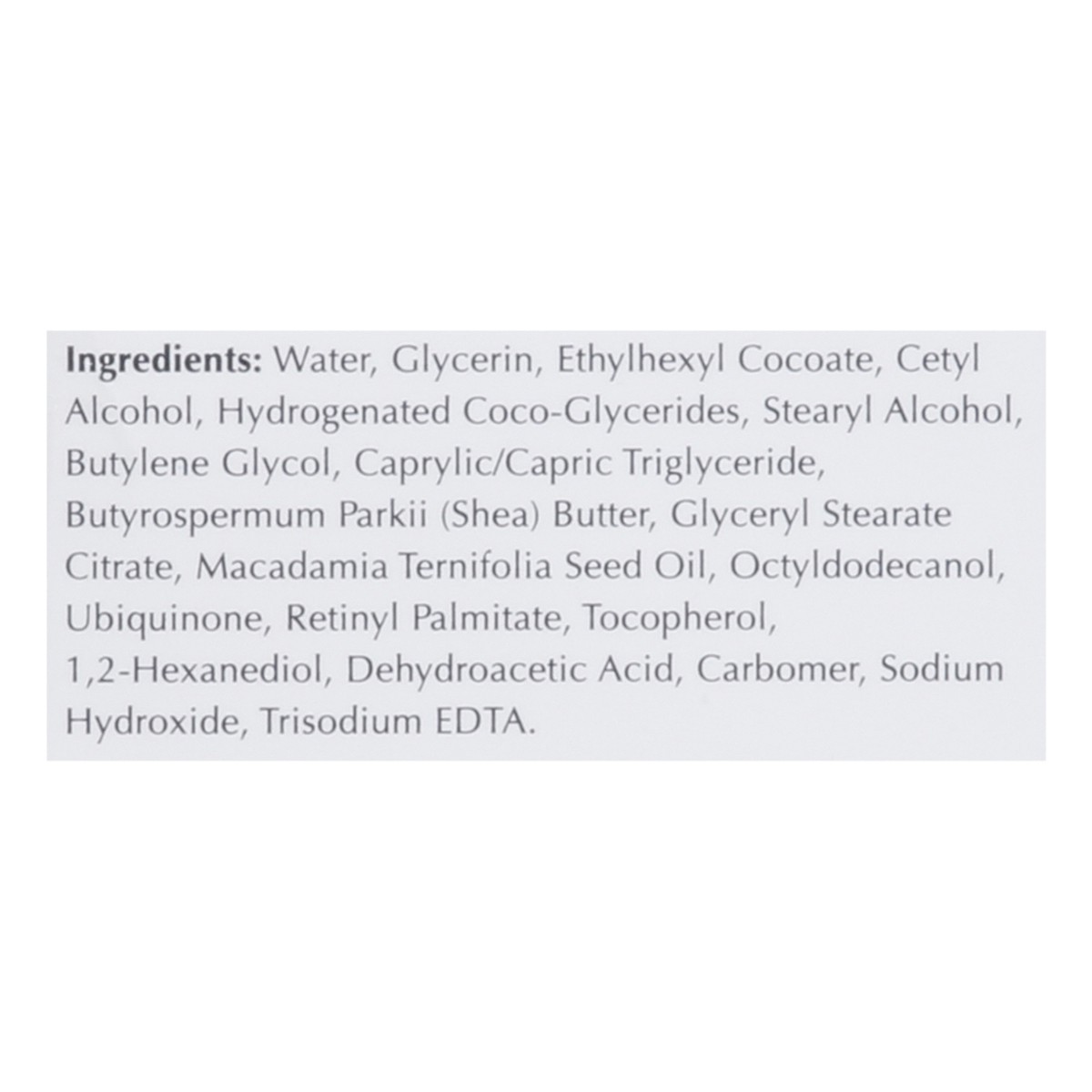 Water, Glycerin, Ethylhexyl Cocoate, Cetyl Alcohol, Hydrogenated Coco-Glycerides, Stearyl Alcohol, Butylene Glycol, Caprylic/Capric Triglyceride, Butyrospermum Parkii (Shea) Butter, Glyceryl Stearate …