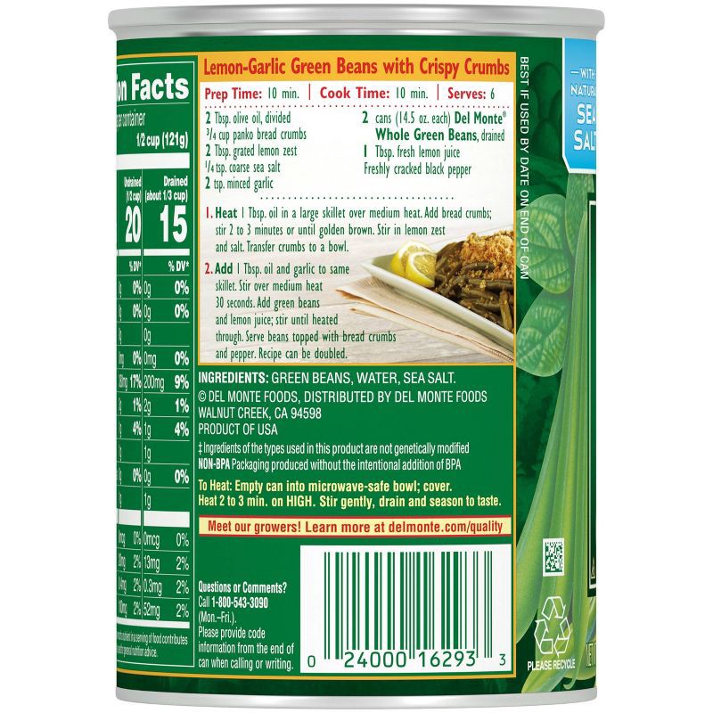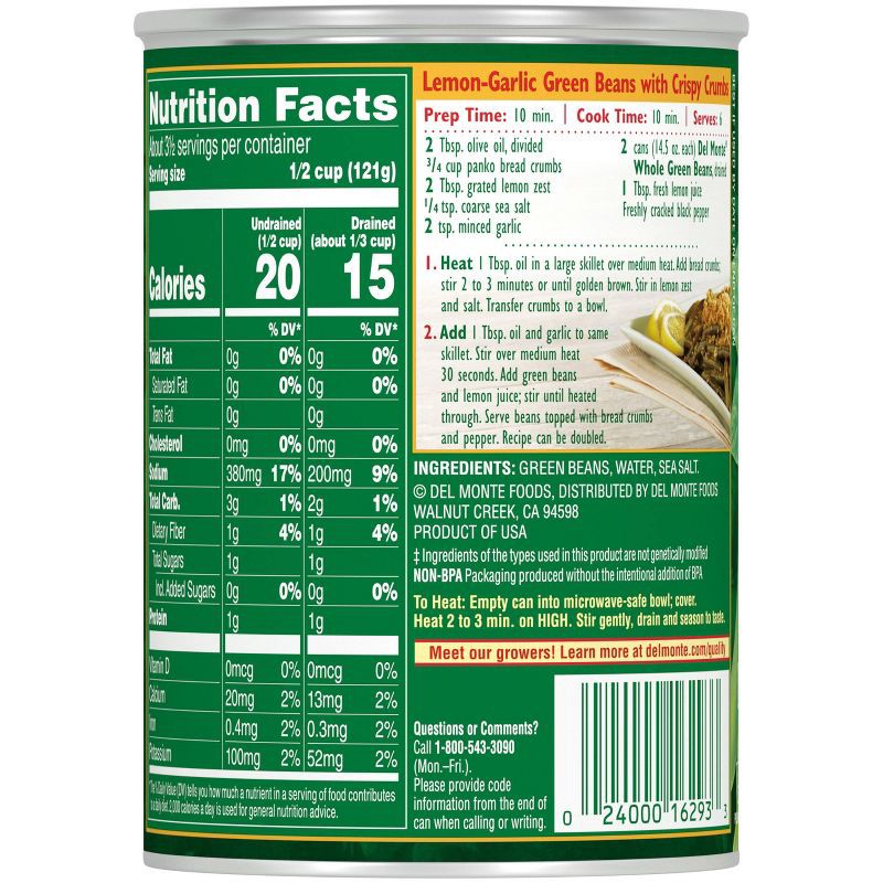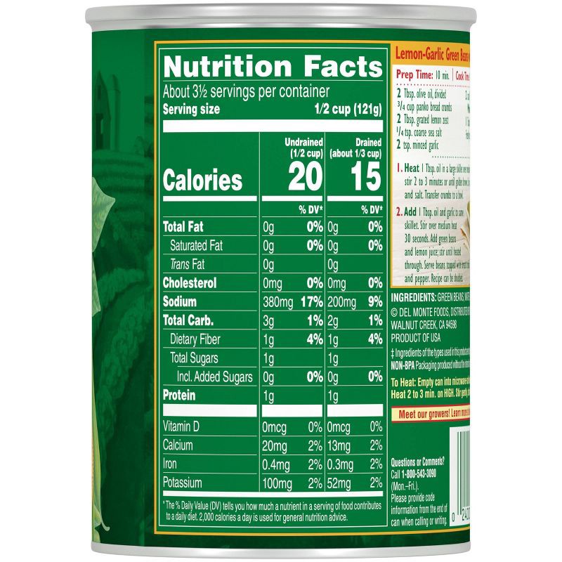 - DEL MONTE canned green beans are harvested at peak freshness and packed to seal in essential nutrients and delicious green bean flavor