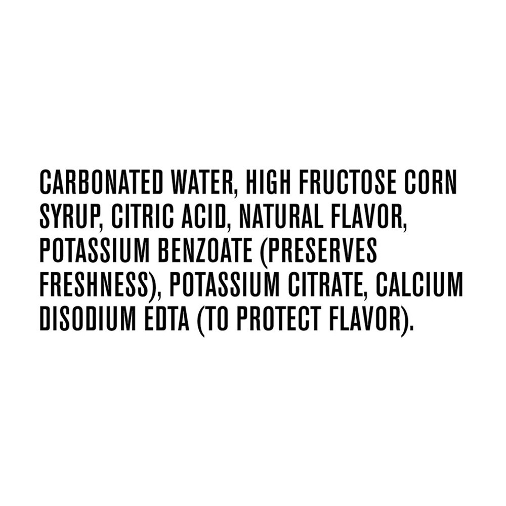 Carbonated Water, High Fructose Corn Syrup, Citric Acid, Natural Flavor, Potassium Benzoate (Preserves Freshness), Potassium Citrate, Calcium Disodium EDTA (to Protect Flavor).
