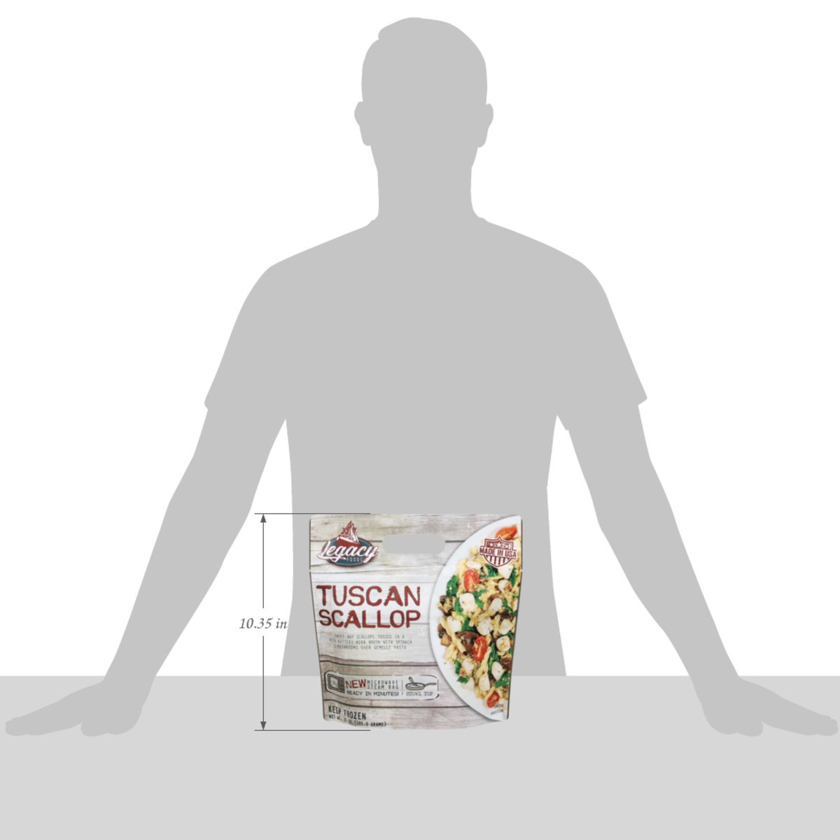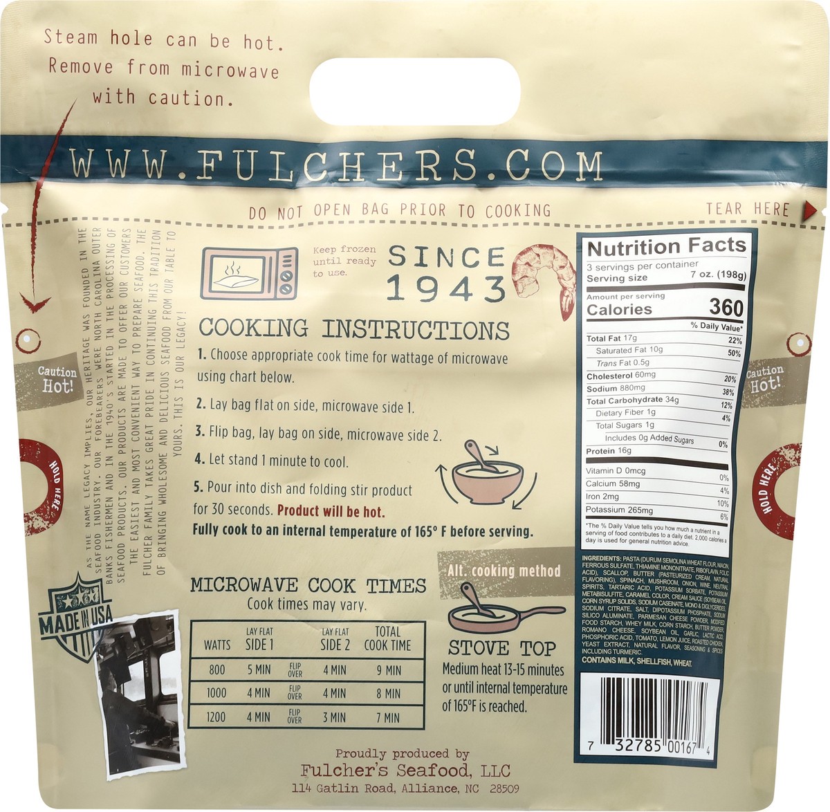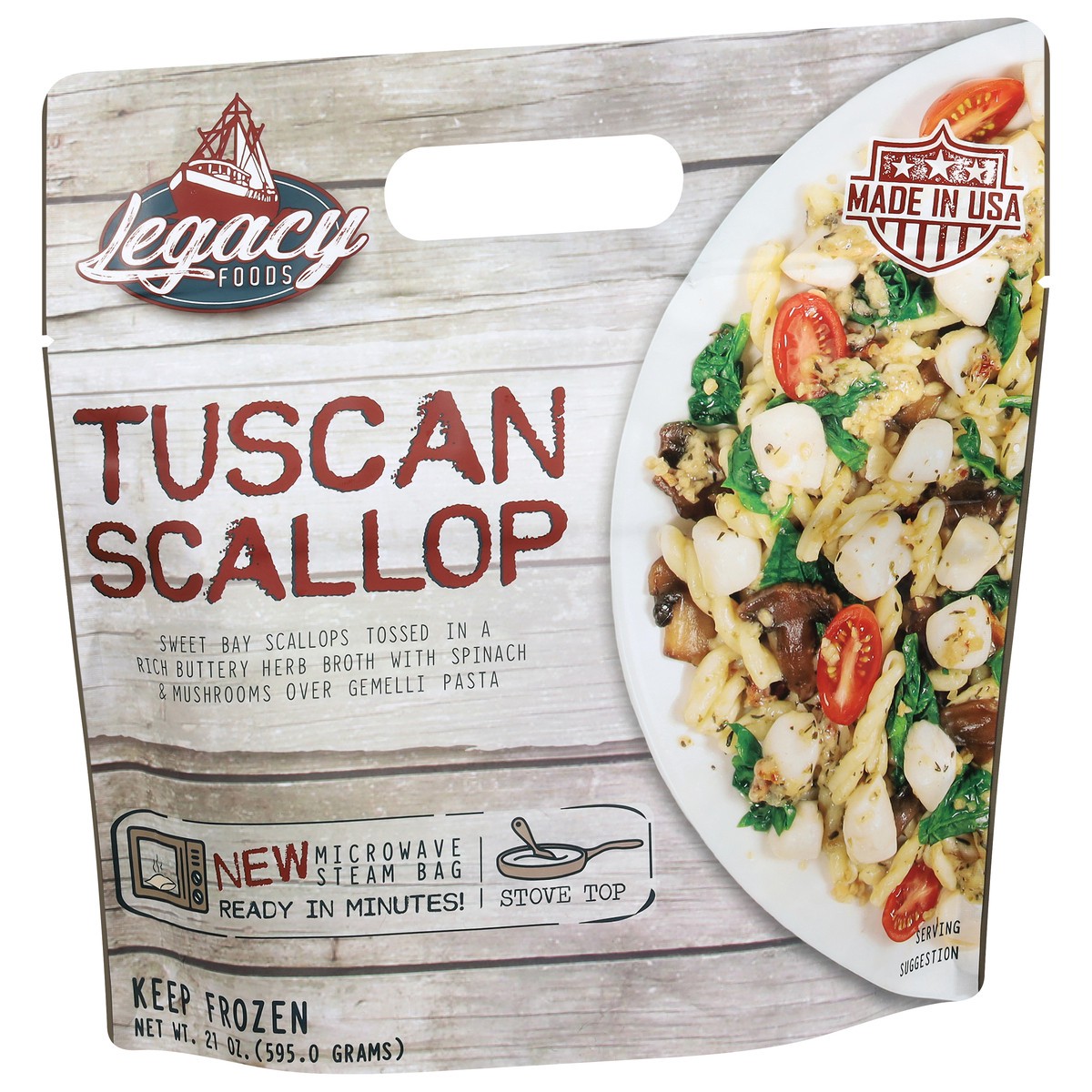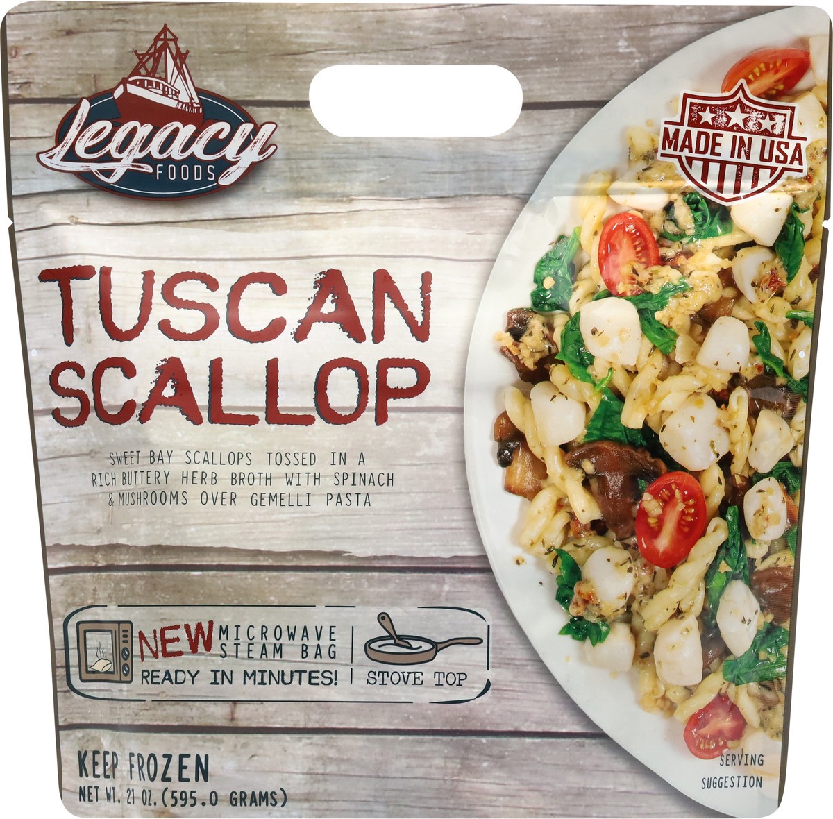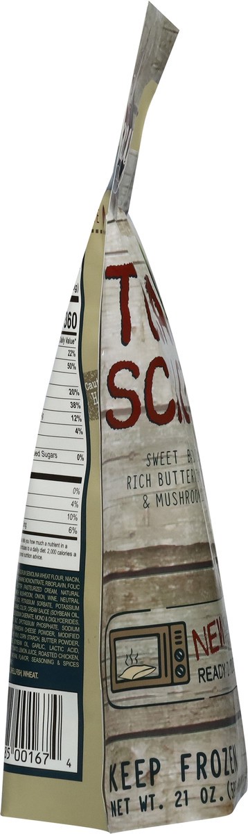 Pasta (Durum Semolina Wheat Flour, Niacin, Ferrous Sulfate, Thiamine Mononitrate, Riboflavin, Folic Acid), Scallop, Butter (Pasteurized Cream, Natural Flavoring), Spinach, Mushroom, Onion, Wine, Neutr…