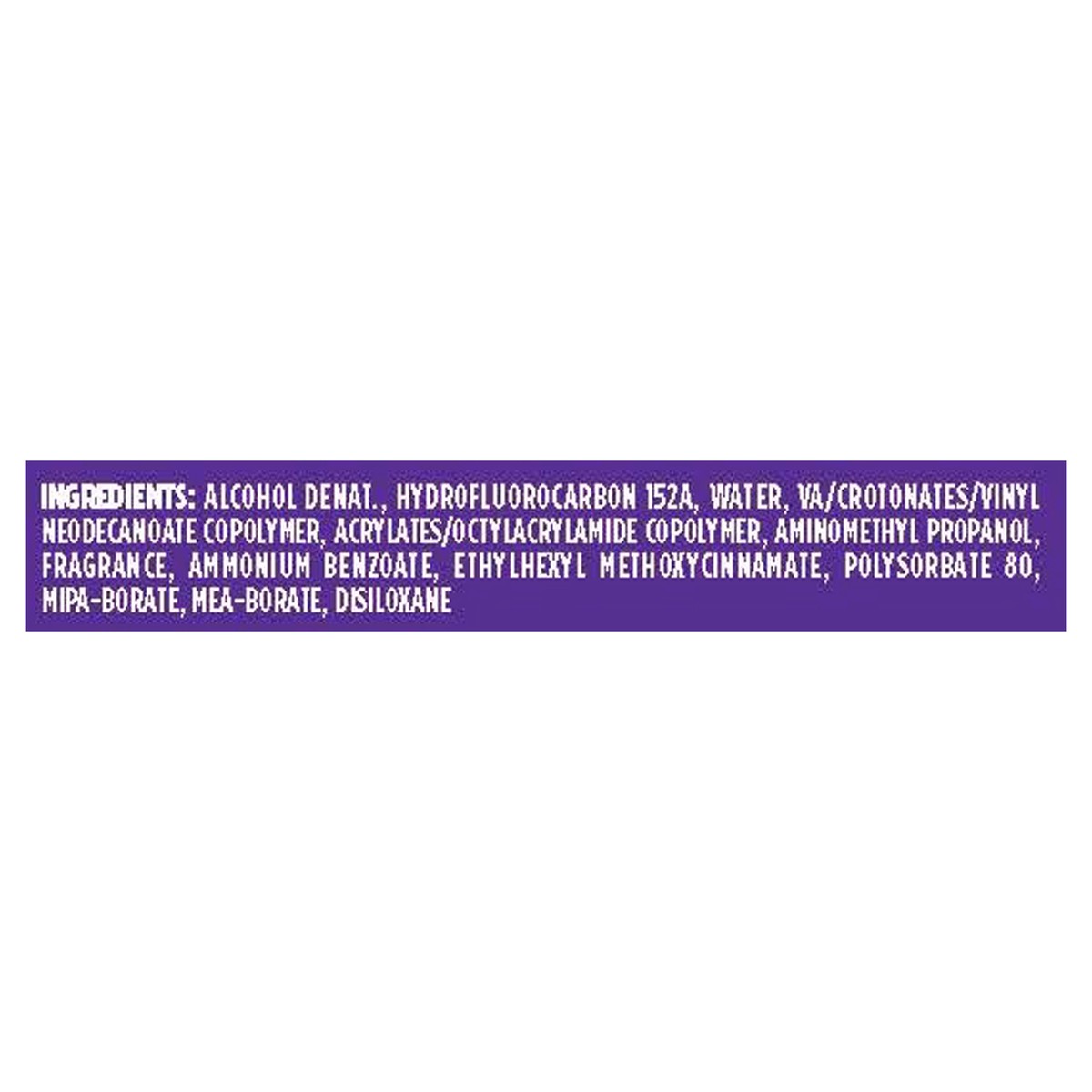Alcohol Denat., Hydrofluorocarbon 152a, Water, VA/Crotonates/Vinyl Neodecanoate Copolymer, Acrylates/Octy Lacrylamide Copolymer, Aminomethyl Propanol, Fragrance, Ammonium Benzoate, Ethylhexyl Methoxy …