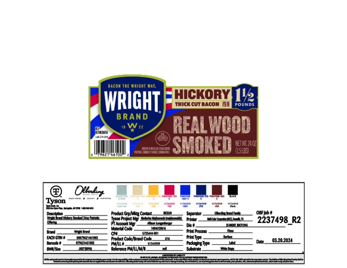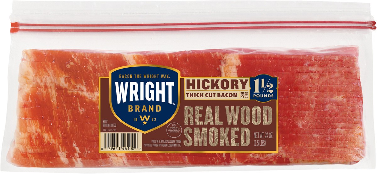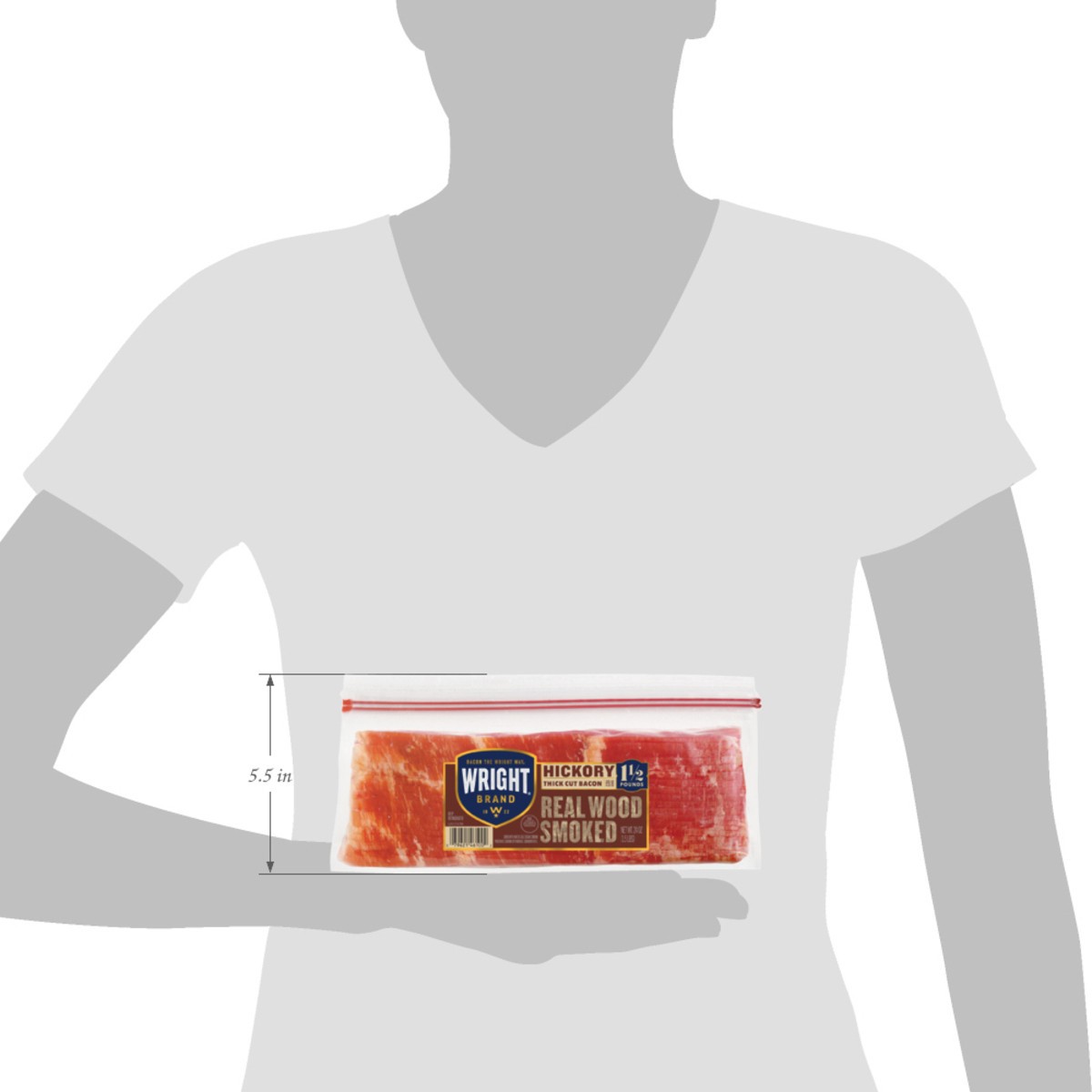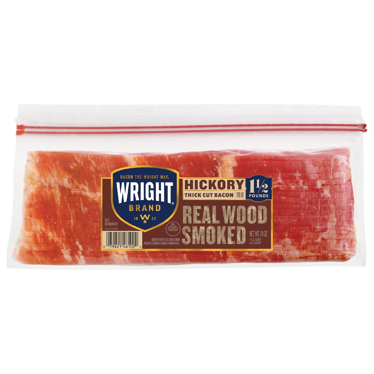 The uncompromising flavor of Wright Brand Thick Sliced Hickory Smoked Bacon doesn't come easy. Hand selected pork belly is trimmed into thick marbled pork slices, then cured with our 90 year old recip…
