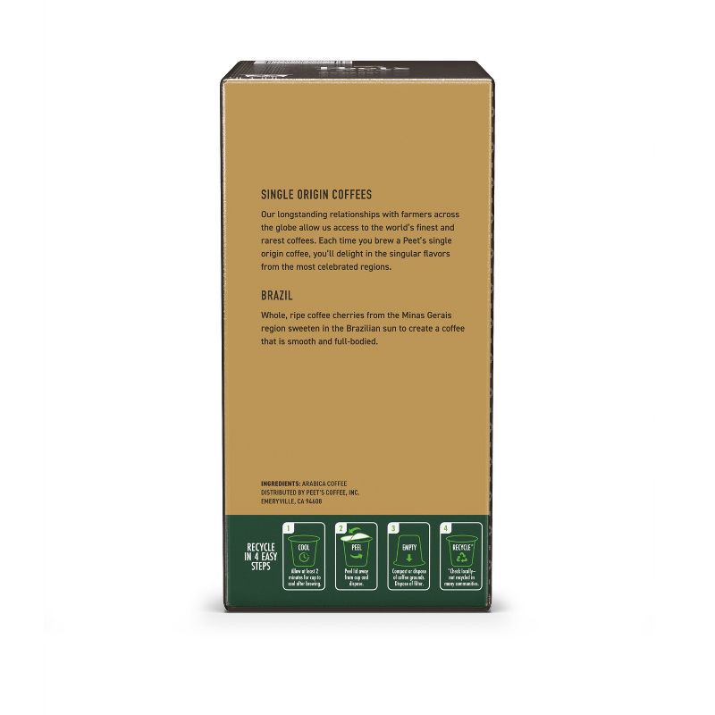 - Contains one (1) Box of 22 Peet's Single Origin Brazil Coffee Single Serve Coffee Pods - 100% Arabica Coffee.