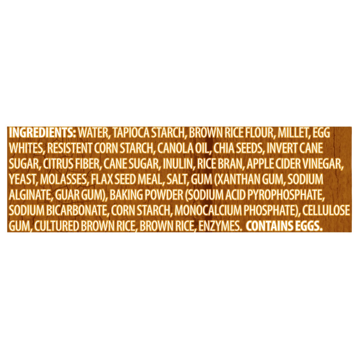 Water, Tapioca Starch, Brown Rice Flour, Millet, Egg Whites, Resistent Corn Starch, Canola Oil, Chia Seeds, Invert Cane Sugar, Citrus Fiber, Cane Sugar, Inulin, Rice Bran, Apple Cider Vinegar, Yeast, …