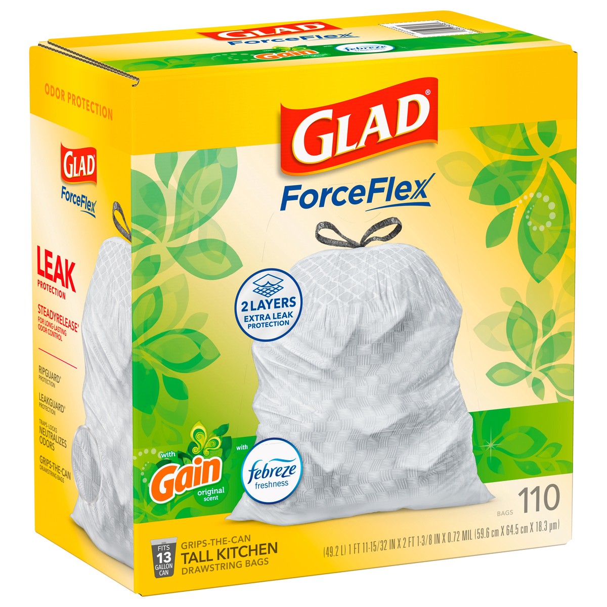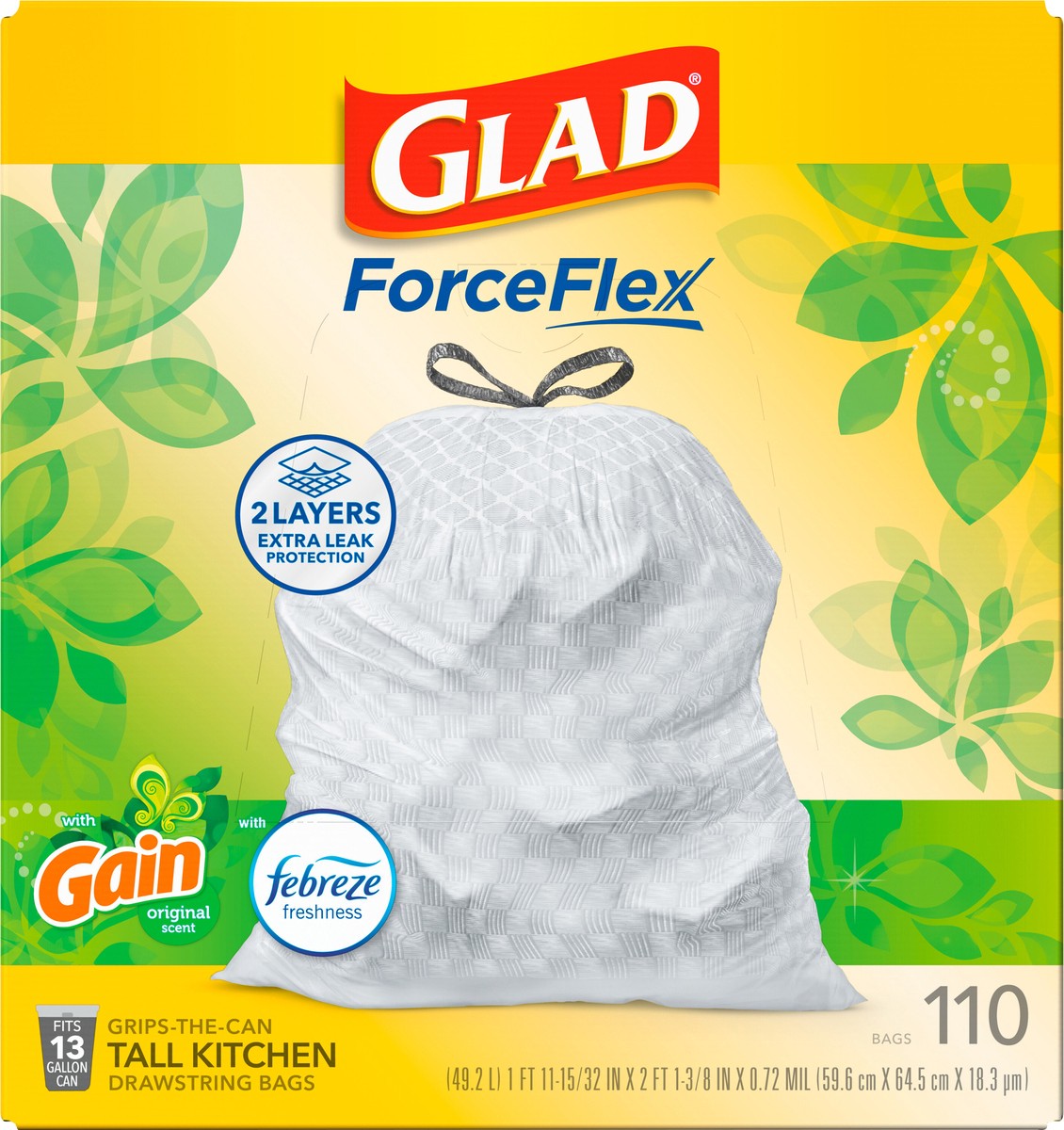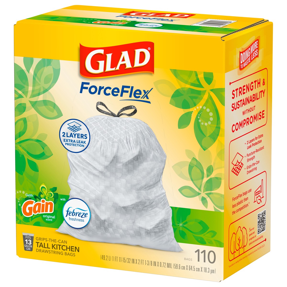 Glad Forceflex Tall Kitchen Drawstring Trash Bags 13 Gallon White Trash Bag Gain Original Scent - 110 Ct