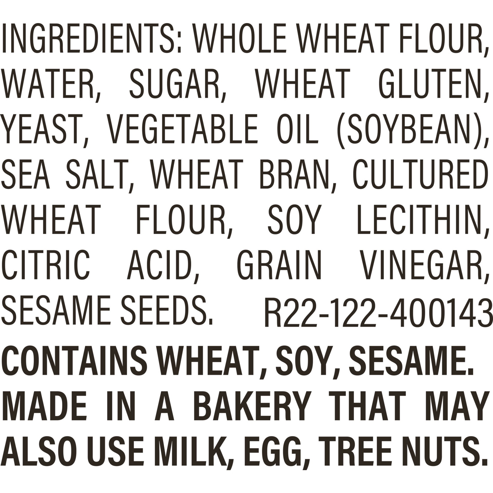 Whole Wheat Flour, Water, Sugar, Wheat Gluten, Yeast, Vegetable Oil (Soybean), Sea Salt, Wheat Bran, Cultured Wheat Flour, Soy Lecithin, Citric Acid, Grain Vinegar, Sesame Seeds.