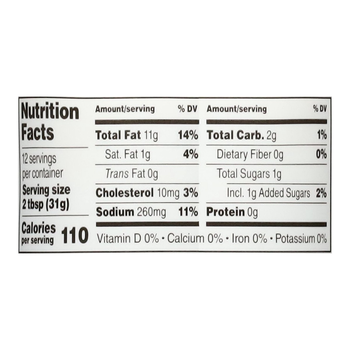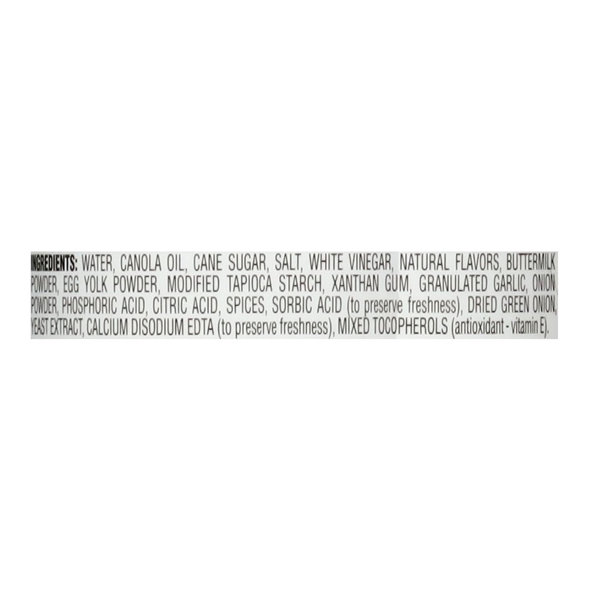 Water, Canola Oil, Cane Sugar, Salt, White Vinegar, Natural Flavors, Buttermilk Powder, Egg Yolk Powder, Modified Tapioca Starch, Xanthan Gum, Granulated Garlic, Onion, Powder, Phosphoric Acid, Citric…