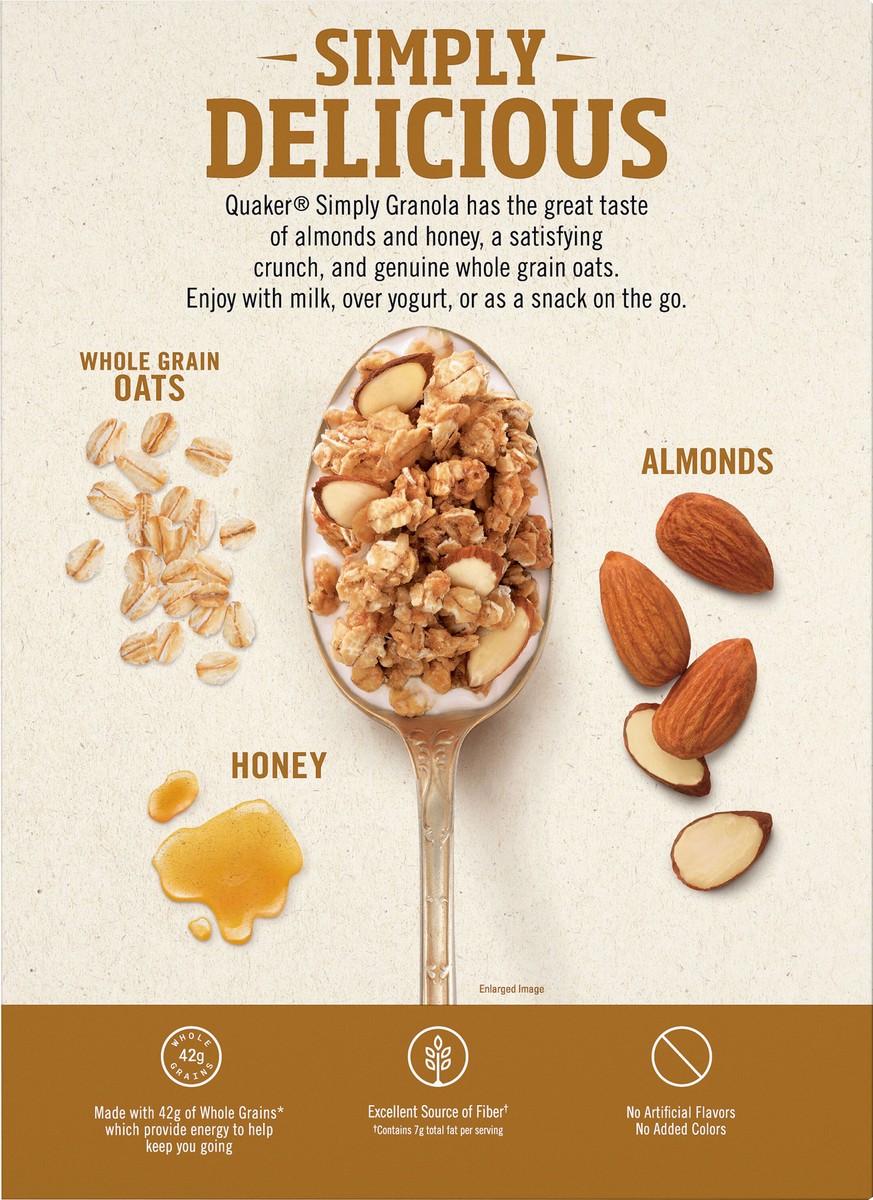 Estd. 1877. Simply Delicious: Quaker Simply Granola has the great taste of almonds and honey, a satisfying crunch, and genuine whole grain oats. Enjoy wit milk, over yogurt, or as a snack on the go. W…