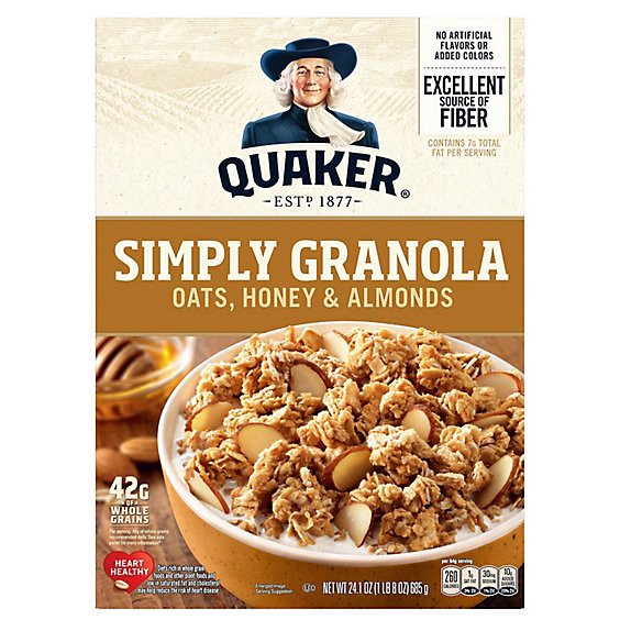Estd. 1877. Simply Delicious: Quaker Simply Granola has the great taste of almonds and honey, a satisfying crunch, and genuine whole grain oats. Enjoy wit milk, over yogurt, or as a snack on the go. W…
