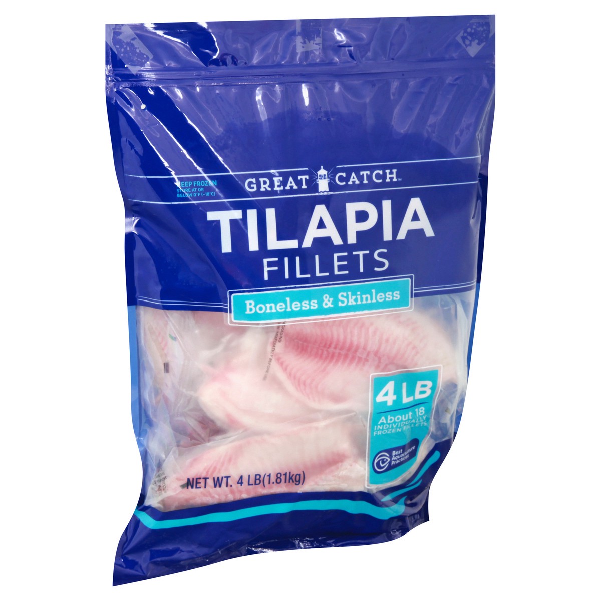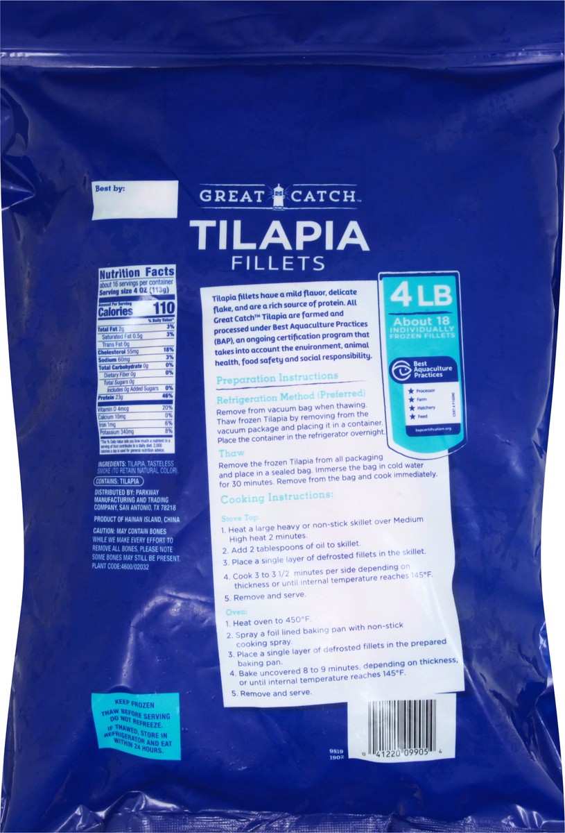 About 18 individually frozen fillets. Tilapia Fillets have a mild flavor, delicate flake, and are a rich source of protein. All Great Catch Tilapia are farmed and processed under Best Aquacultture Pra…