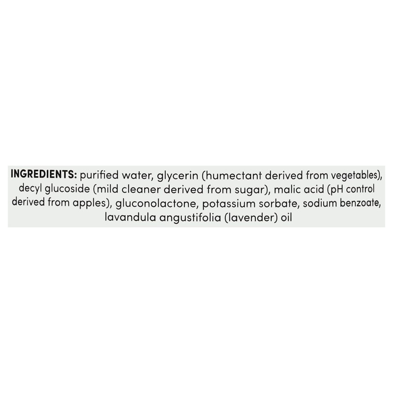 Purified Water, Glycerin (Humectant Derived from Vegetables), Decyl Glucoside (Mild Cleaner Derived from Sugar), Malic Acid (pH Control Derived from Apples), Gluconolactone, Potassium Sorbate, Sodium …