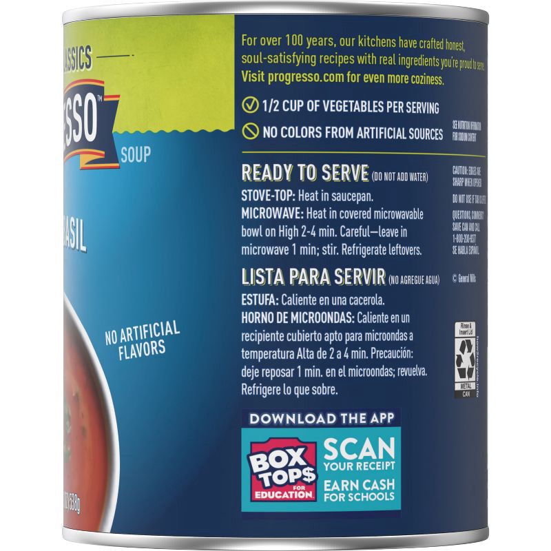 - CONTAINS: One 19 oz can of Progresso Vegetable Classics Tomato Basil Soup; About two servings per can