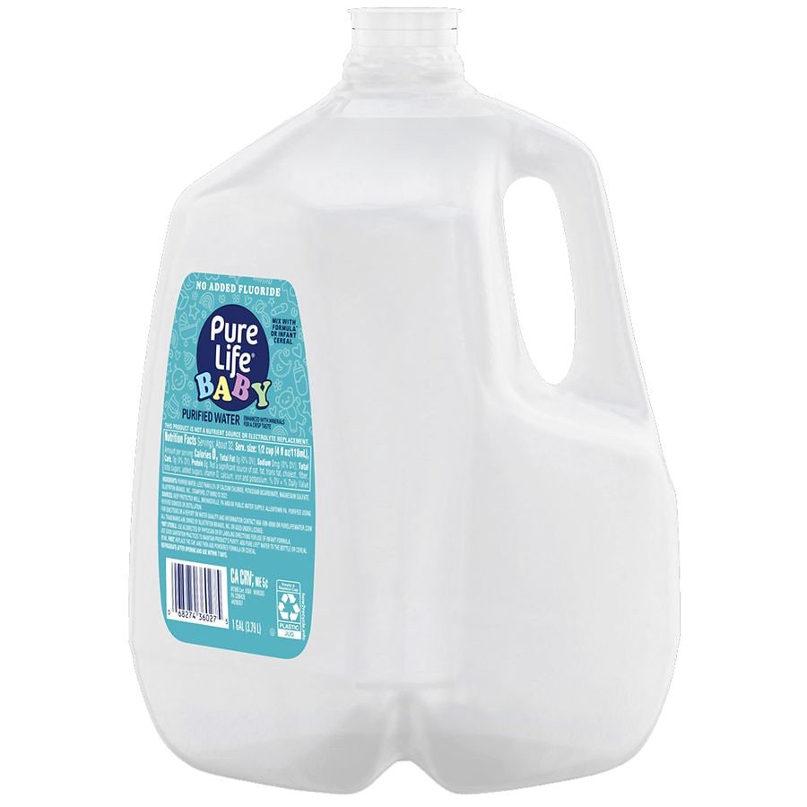 - Contains (1) 1-Gallon Jug of Pure Life Baby Water With No Added Fluoride. Packaging may vary. Not sterile. Use as directed by physician or by labeling directions for use of infant formula