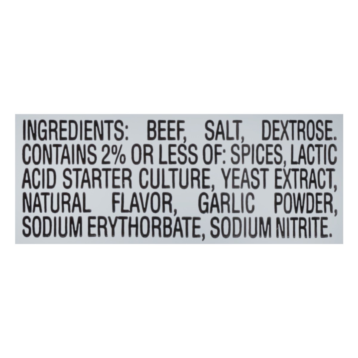 Beef, Salt, Dextrose, Contains 2% or Less of: Spices, Lactic Acid Starter Culture, Yeast Extract, Natural Flavor, Garlic Powder, Sodium Erythorbate, Sodium Nitrite.