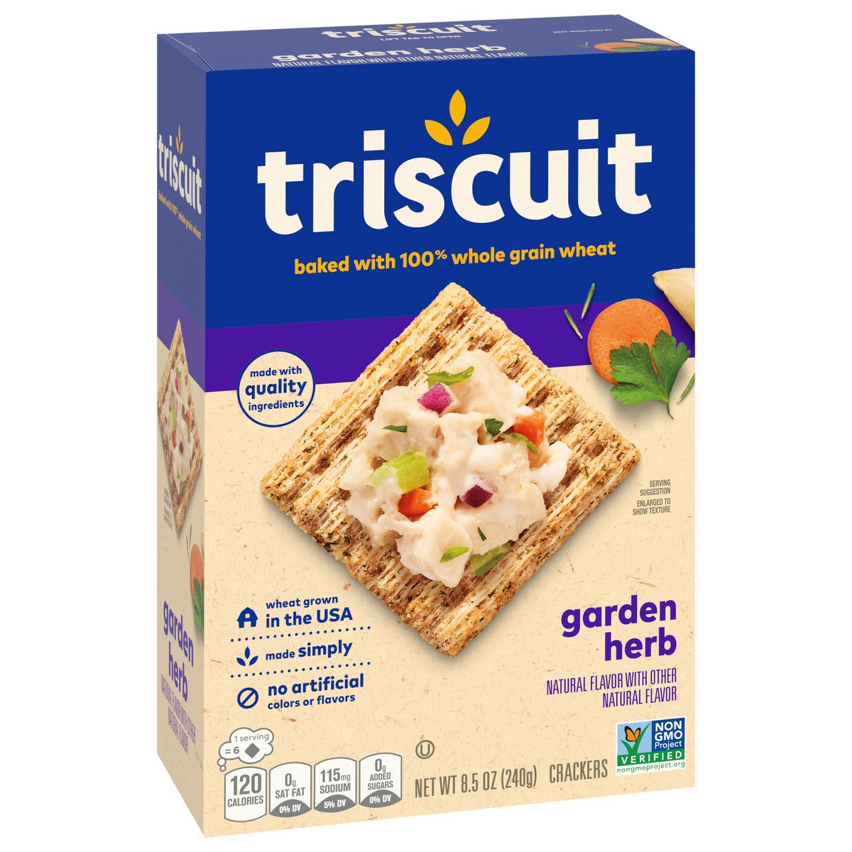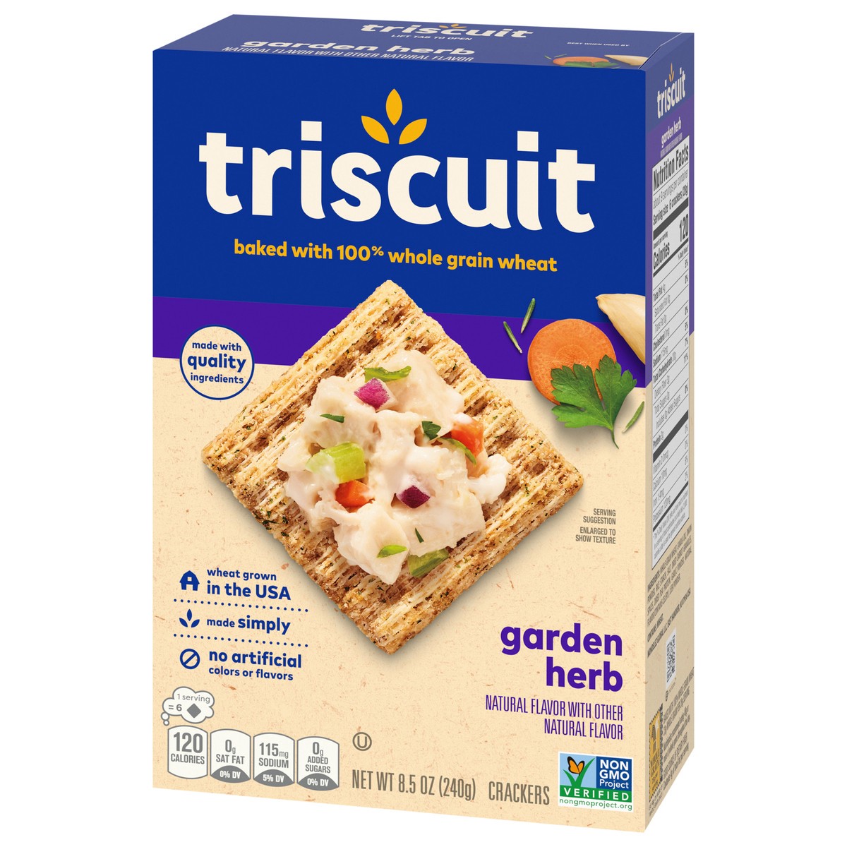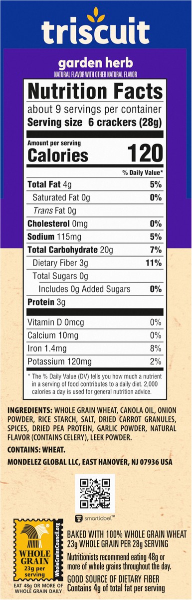 Triscuit Garden Herb Whole Grain Wheat Crackers are made simply with quality ingredients. Baked to perfection, these snack crackers use 100% whole grain wheat proudly grown in the USA and sunflower oi…