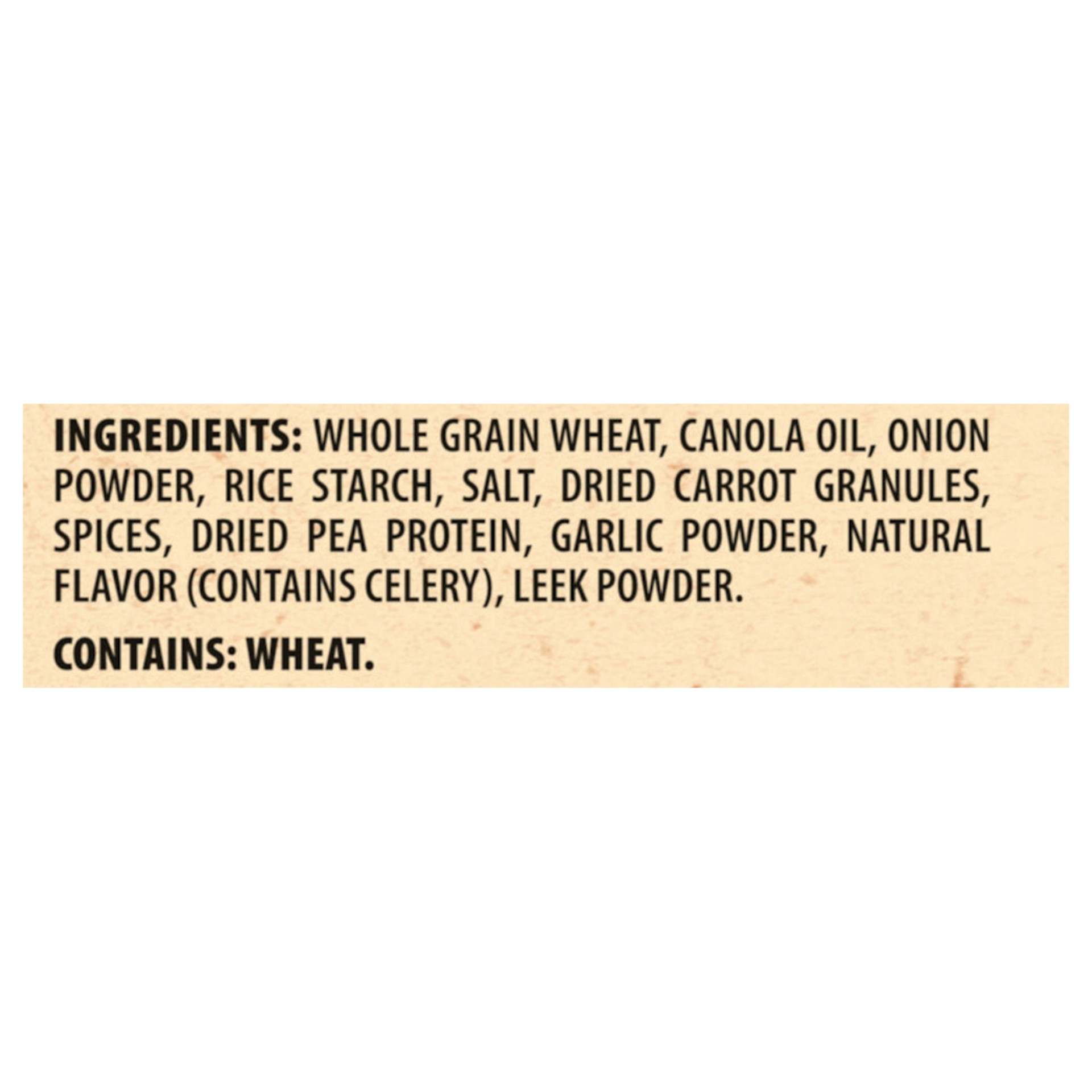 Whole Grain Wheat, Canola Oil, Onion Powder, Rice Starch, Salt, Dried Carrot Granules, Spices, Dried Pea Protein, Garlic Powder, Natural Flavor (Contains Celery), Leek Powder.