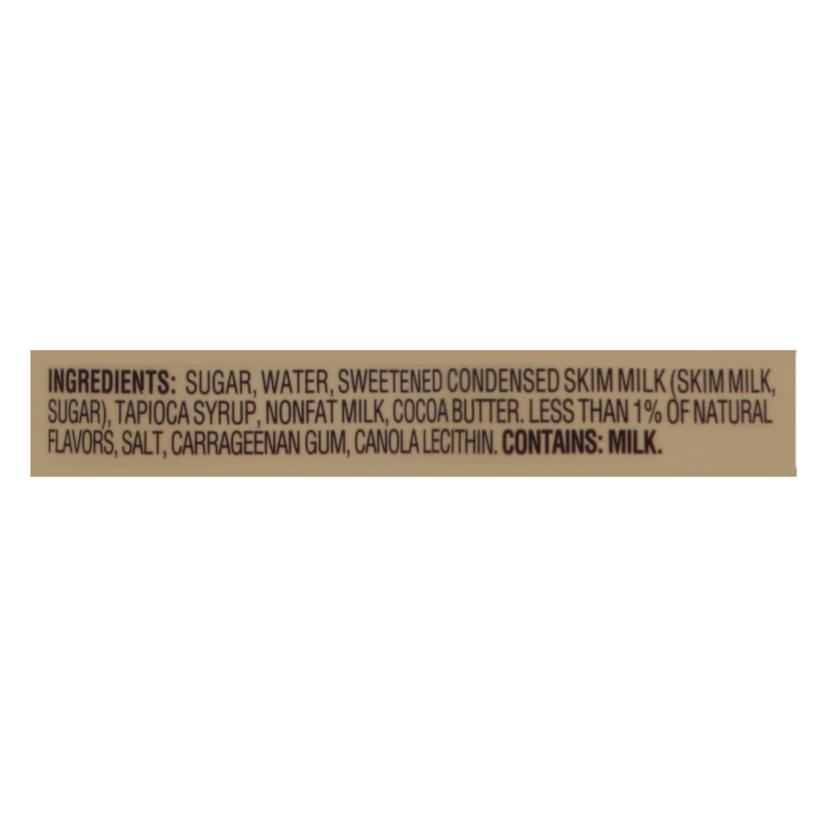 Sugar, Water, Sweetened Condensed Skim Milk (Skim Milk, Sugar), Tapioca Syrup, Nonfat Milk, Cocoa Butter. Less than 1% of Natural Flavors, Salt, Carrageenan Gum, Canola Lecithin.