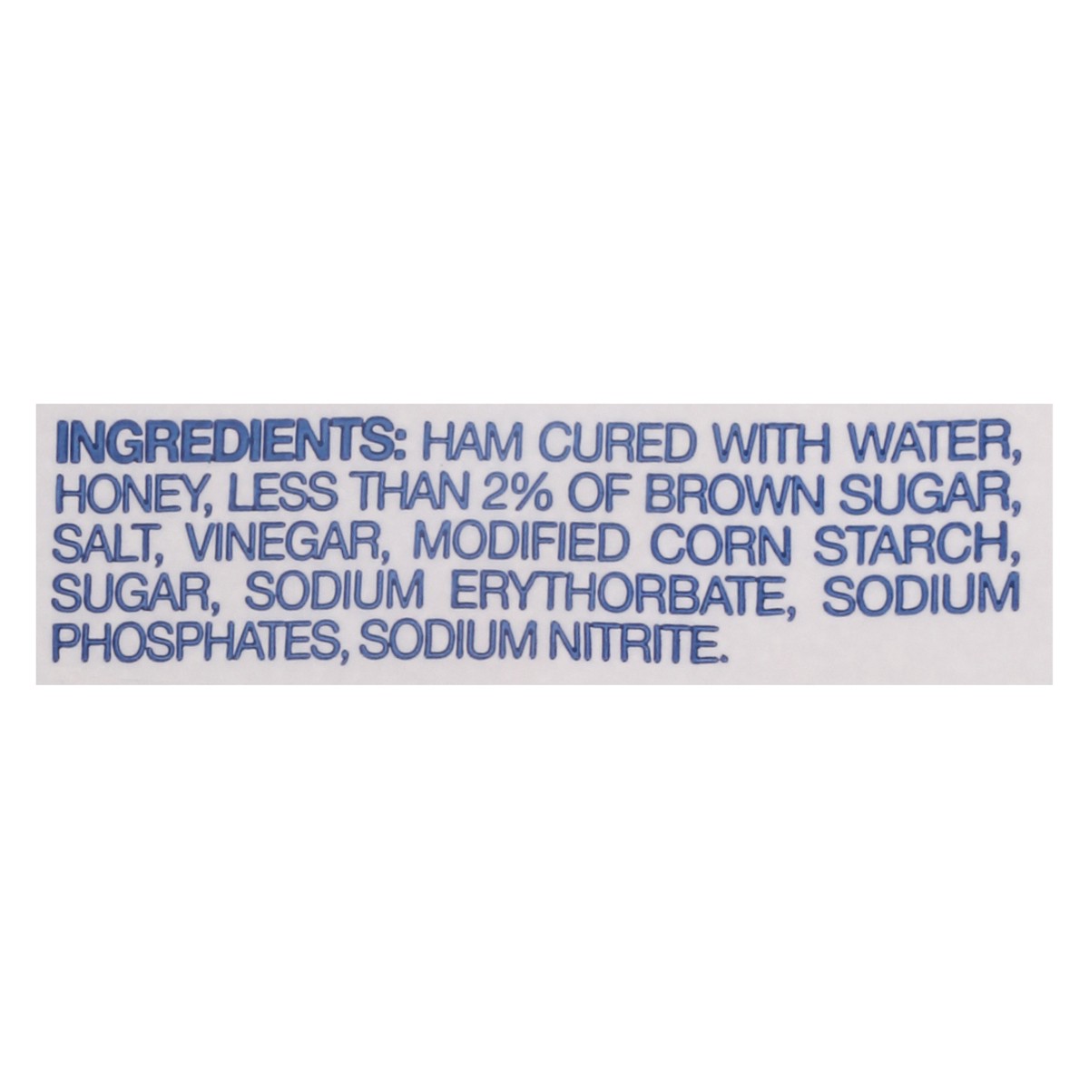 Ham Cured with Water, Honey, Less than 2% of Brown Sugar, Salt, Vinegar, Modified Corn Starch, Sugar, Sodium Erythorbate, Sodium Phosphates, Sodium Nitrite.