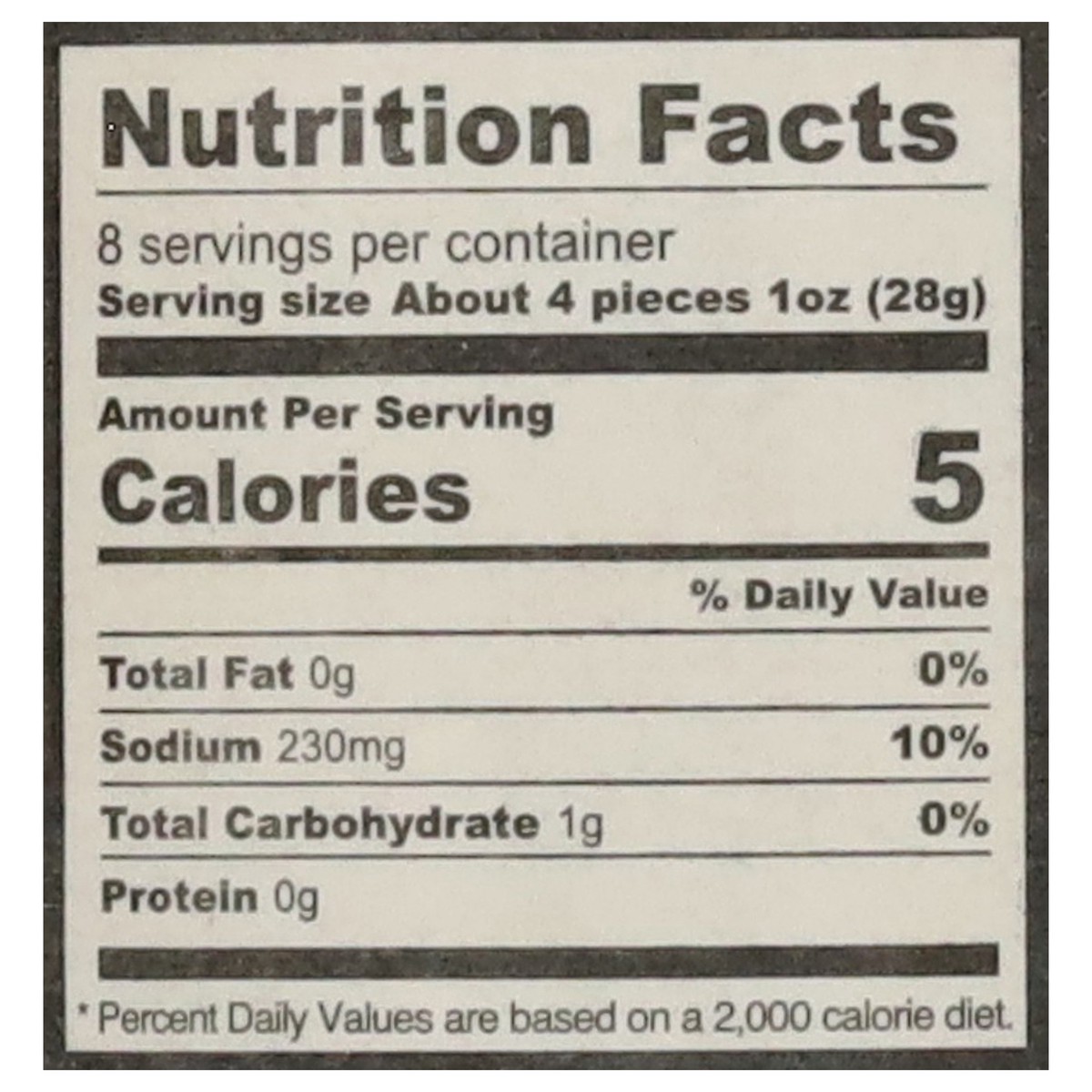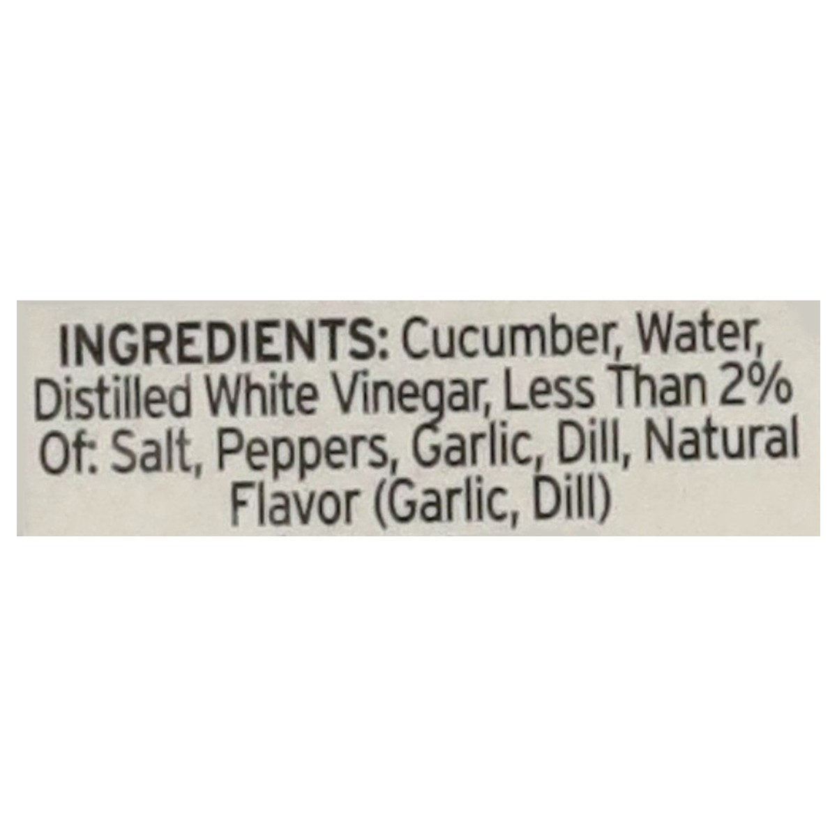 Cucumber, Water, Distilled White Vinegar, Less than 2% of: Salt, Peppers, Garlic, Dill, Natural Flavor (Garlic, Dill).