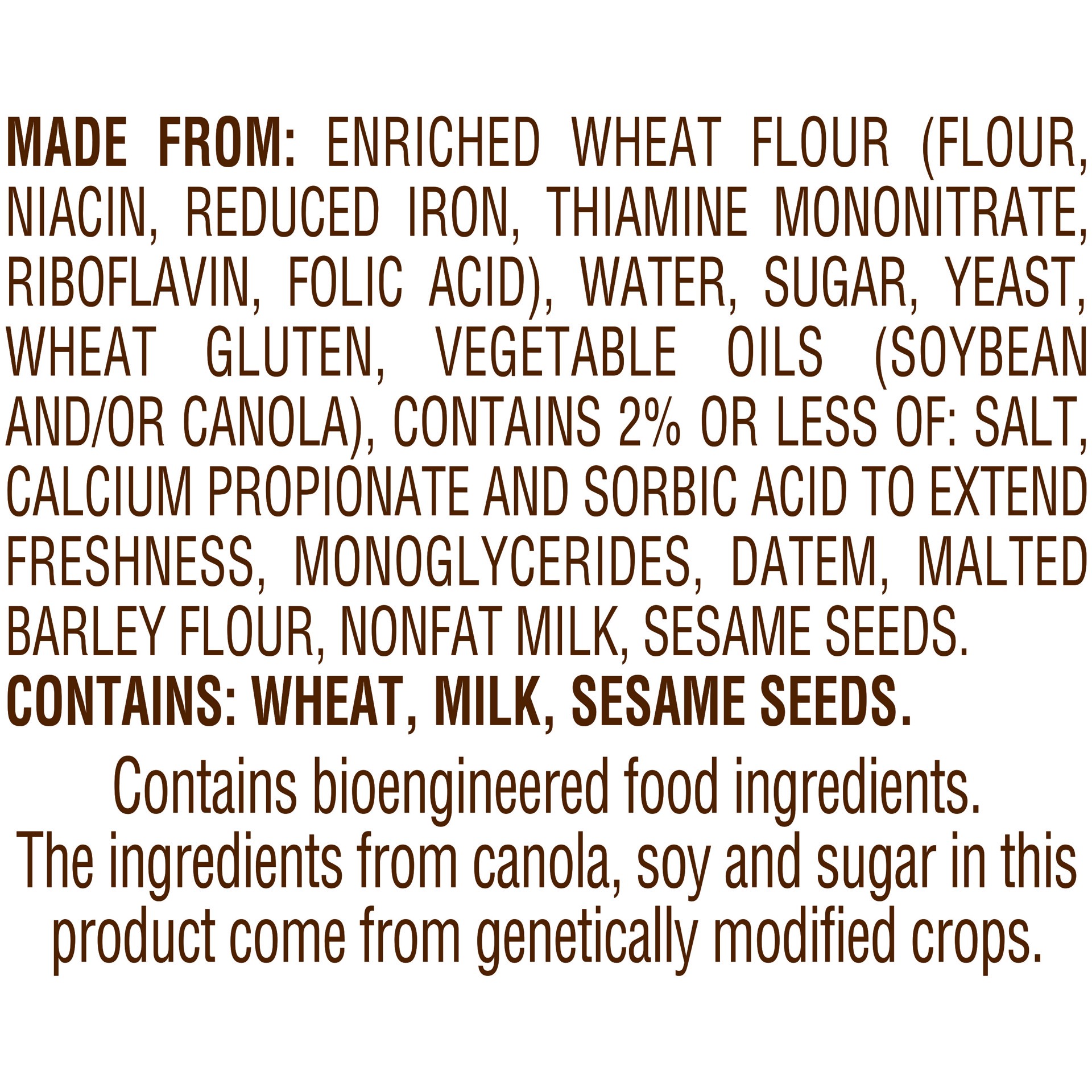 MADE FROM: ENRICHED WHEAT FLOUR (FLOUR, NIACIN, REDUCED IRON, THIAMINE MONONITRATE, RIBOFLAVIN, FOLIC ACID), WATER, SUGAR, YEAST, WHEAT GLUTEN, VEGETABLE OILS (SOYBEAN AND/OR CANOLA), CONTAINS 2% OR L…