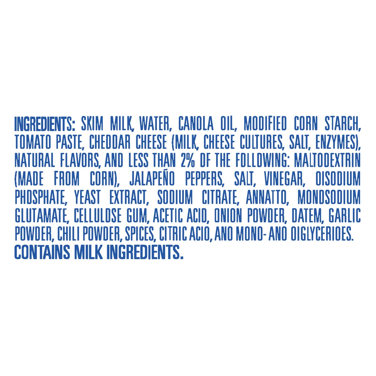 Skim Milk, Water, Canola Oil, Modified Corn Starch, Tomato Paste, Cheddar Cheese (Milk, Cheese Cultures, Salt, Enzymes), Natural Flavors, and less than 2% of the following: Maltodextrin (Made from Cor…