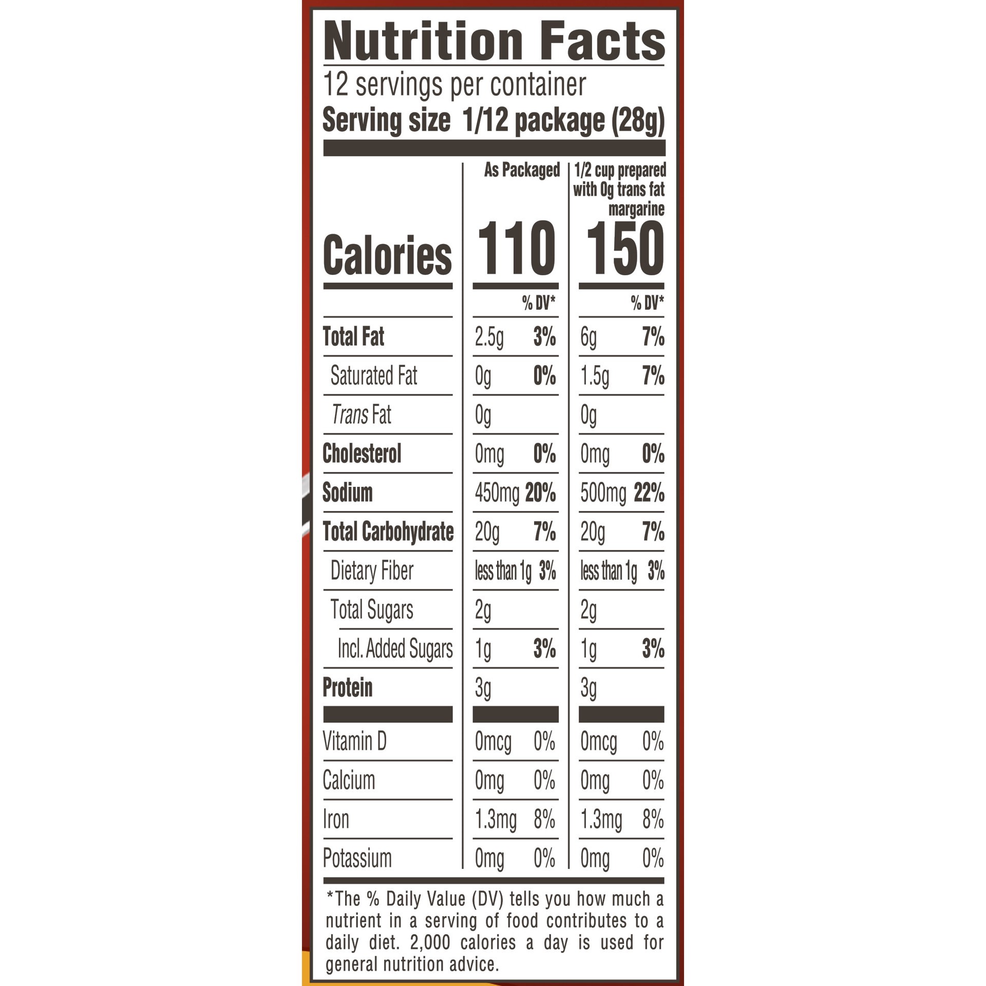 Chicken with real chicken broth. Per 1/12 Box (Unprepared): 110 calories; 0 g sat fat (0% DV); 450 mg sodium (19% DV); 2 g total sugars. See nutrition facts for as prepared. Makes up to 12 1/2 cup ser…
