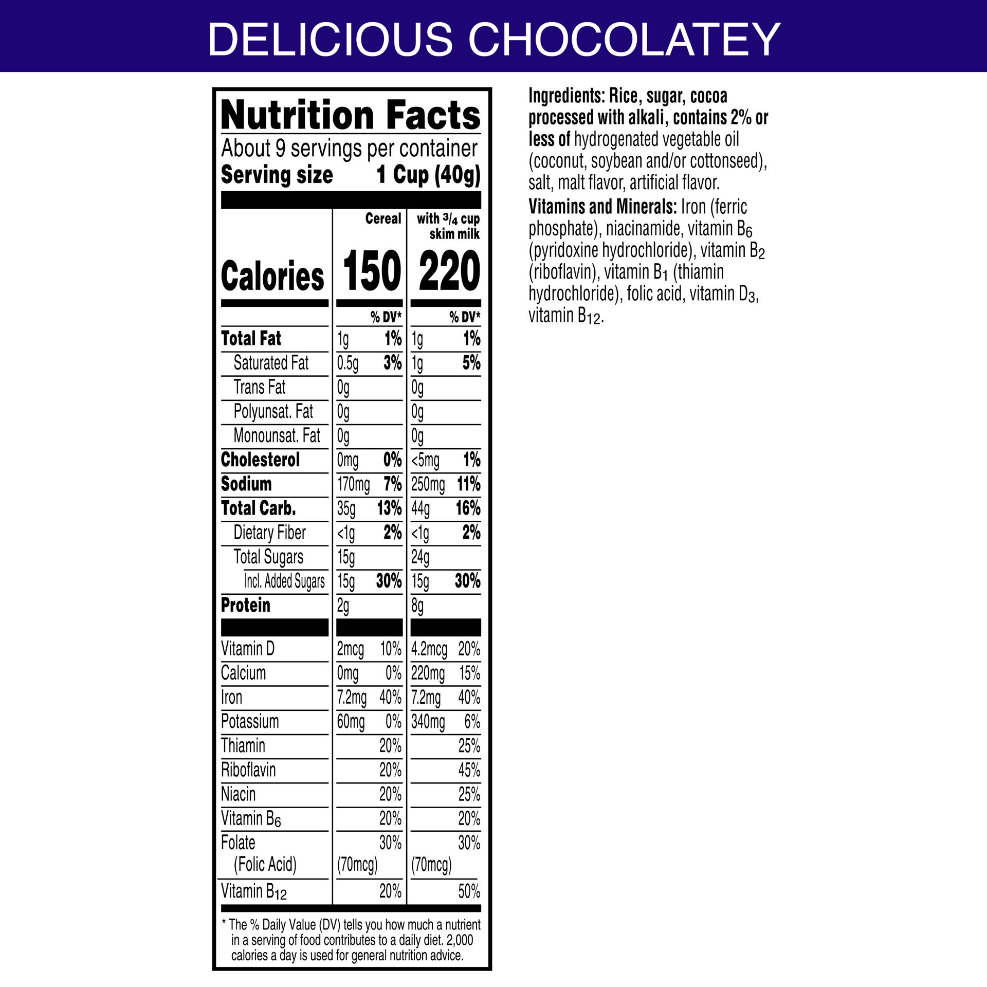 Rice, Sugar, Cocoa Processed with Alkali, Contains 2% or Less of Hydrogenated Vegetable Oil (Coconut, Soybean and/or Cottonseed), Salt, Malt Flavor, Artificial Flavor, Vitamins and Minerals: Iron (Fer…