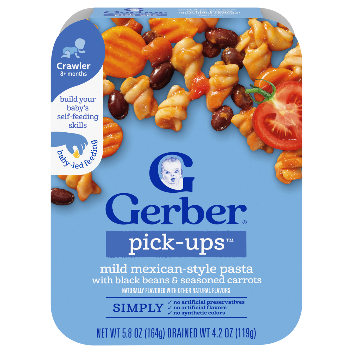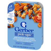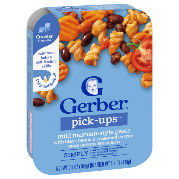- BABY MEALTIME: Gerber Pick-Ups Mexican-Style baby pasta comes with black beans and seasoned carrots. Ready to eat in under 5 minutes