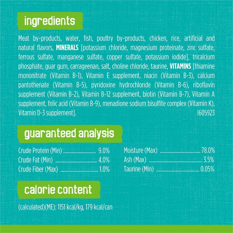 Meat By-Products, Water, Fish, Poultry By-Products, Chicken, Rice, Artificial and Natural Flavors, Minerals [Potassium Chloride, Magnesium Proteinate, Zinc Sulfate, Ferrous Sulfate, Manganese Sulfate,…