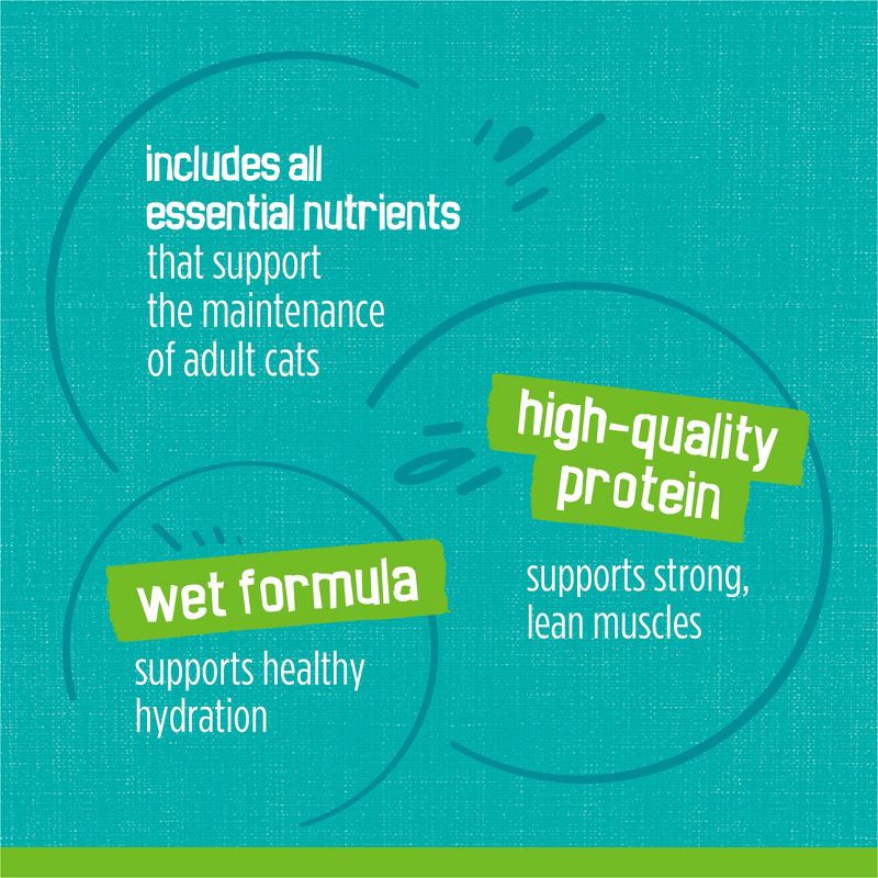 - Canned cat food packaged in recyclable cat food cans with no artificial colors or preservatives